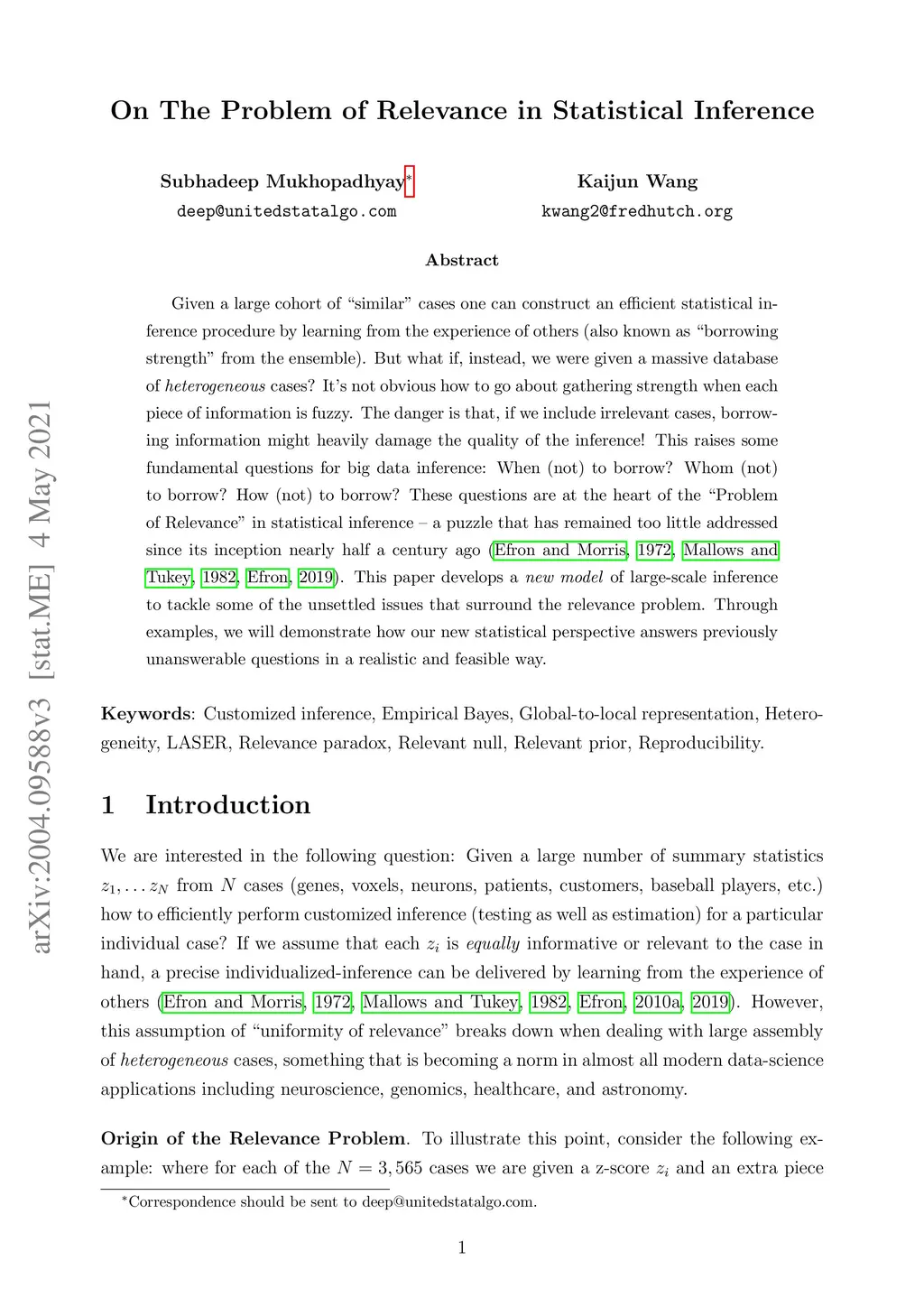 How many statistical inference tools we have for inference from massive data? A huge number, but only when we are ready to assume the given database is homogenous, consisting of a large cohort of "similar" cases. Why we need the homogeneity assumption? To make `learning from the experience of others' or `borrowing strength' possible. But, what if, we are dealing with a massive database of heterogeneous cases (which is a norm in almost all modern data-science applications including neuroscience, genomics, healthcare, and astronomy)? How many methods we have in this situation? Not much, if not ZERO. Why? It's not obvious how to go about gathering strength when each piece of information is fuzzy. The danger is that, if we include irrelevant cases, borrowing information might heavily damage the quality of the inference! This raises some fundamental questions for big data inference: When (not) to borrow? Whom (not) to borrow? How (not) to borrow? These questions are at the heart of the "Problem of Relevance" in statistical inference -- a puzzle that has remained too little addressed since its inception nearly half a century ago. Here we offer the first practical theory of relevance with precisely describable statistical formulation and algorithm. Through examples, we demonstrate how our new statistical perspective answers previously unanswerable questions in a realistic and feasible way.