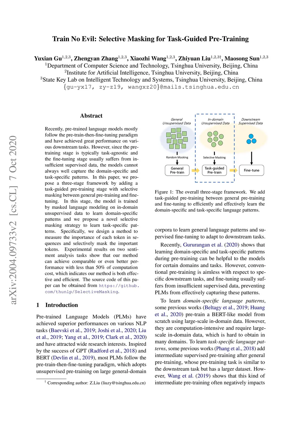 Recently, pre-trained language models mostly follow the pre-train-then-fine-tuning paradigm and have achieved great performance on various downstream tasks. However, since the pre-training stage is typically task-agnostic and the fine-tuning stage usually suffers from insufficient supervised data, the models cannot always well capture the domain-specific and task-specific patterns. In this paper, we propose a three-stage framework by adding a task-guided pre-training stage with selective masking between general pre-training and fine-tuning. In this stage, the model is trained by masked language modeling on in-domain unsupervised data to learn domain-specific patterns and we propose a novel selective masking strategy to learn task-specific patterns. Specifically, we design a method to measure the importance of each token in sequences and selectively mask the important tokens. Experimental results on two sentiment analysis tasks show that our method can achieve comparable or even better performance with less than 50% of computation cost, which indicates our method is both effective and efficient. The source code of this paper can be obtained from https://github.com/thunlp/SelectiveMasking.