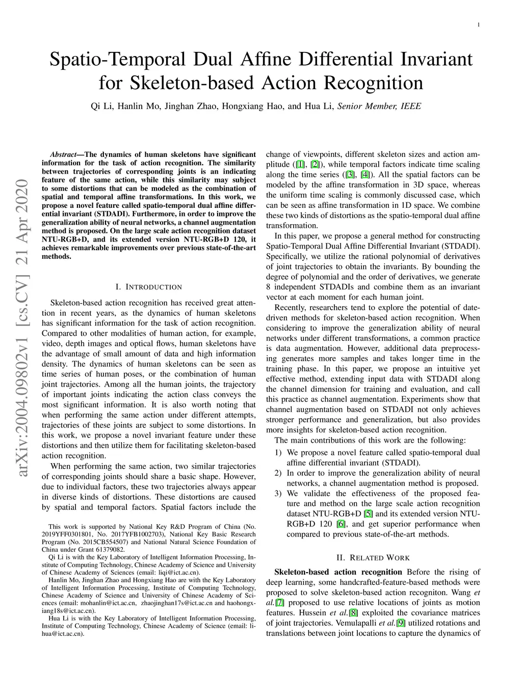 The dynamics of human skeletons have significant information for the task of action recognition. The similarity between trajectories of corresponding joints is an indicating feature of the same action, while this similarity may subject to some distortions that can be modeled as the combination of spatial and temporal affine transformations. In this work, we propose a novel feature called spatio-temporal dual affine differential invariant (STDADI). Furthermore, in order to improve the generalization ability of neural networks, a channel augmentation method is proposed. On the large scale action recognition dataset NTU-RGB+D, and its extended version NTU-RGB+D 120, it achieves remarkable improvements over previous state-of-the-art methods.