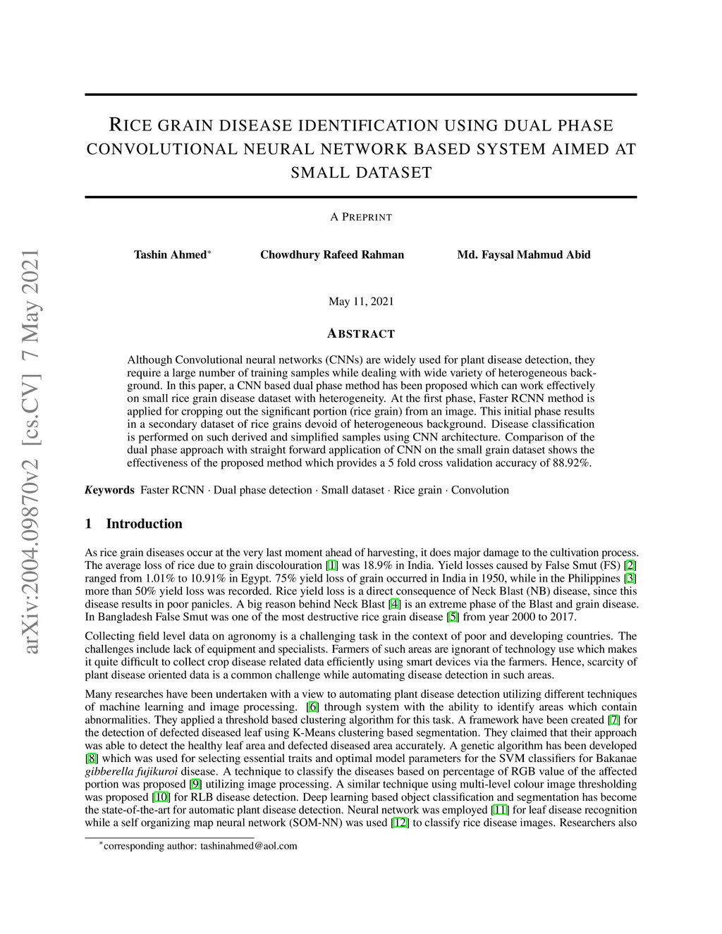 Although Convolutional neural networks (CNNs) are widely used for plant disease detection, they require a large number of training samples when dealing with wide variety of heterogeneous background. In this work, a CNN based dual phase method has been proposed which can work effectively on small rice grain disease dataset with heterogeneity. At the first phase, Faster RCNN method is applied for cropping out the significant portion (rice grain) from the image. This initial phase results in a secondary dataset of rice grains devoid of heterogeneous background. Disease classification is performed on such derived and simplified samples using CNN architecture. Comparison of the dual phase approach with straight forward application of CNN on the small grain dataset shows the effectiveness of the proposed method which provides a 5 fold cross validation accuracy of 88.07%.