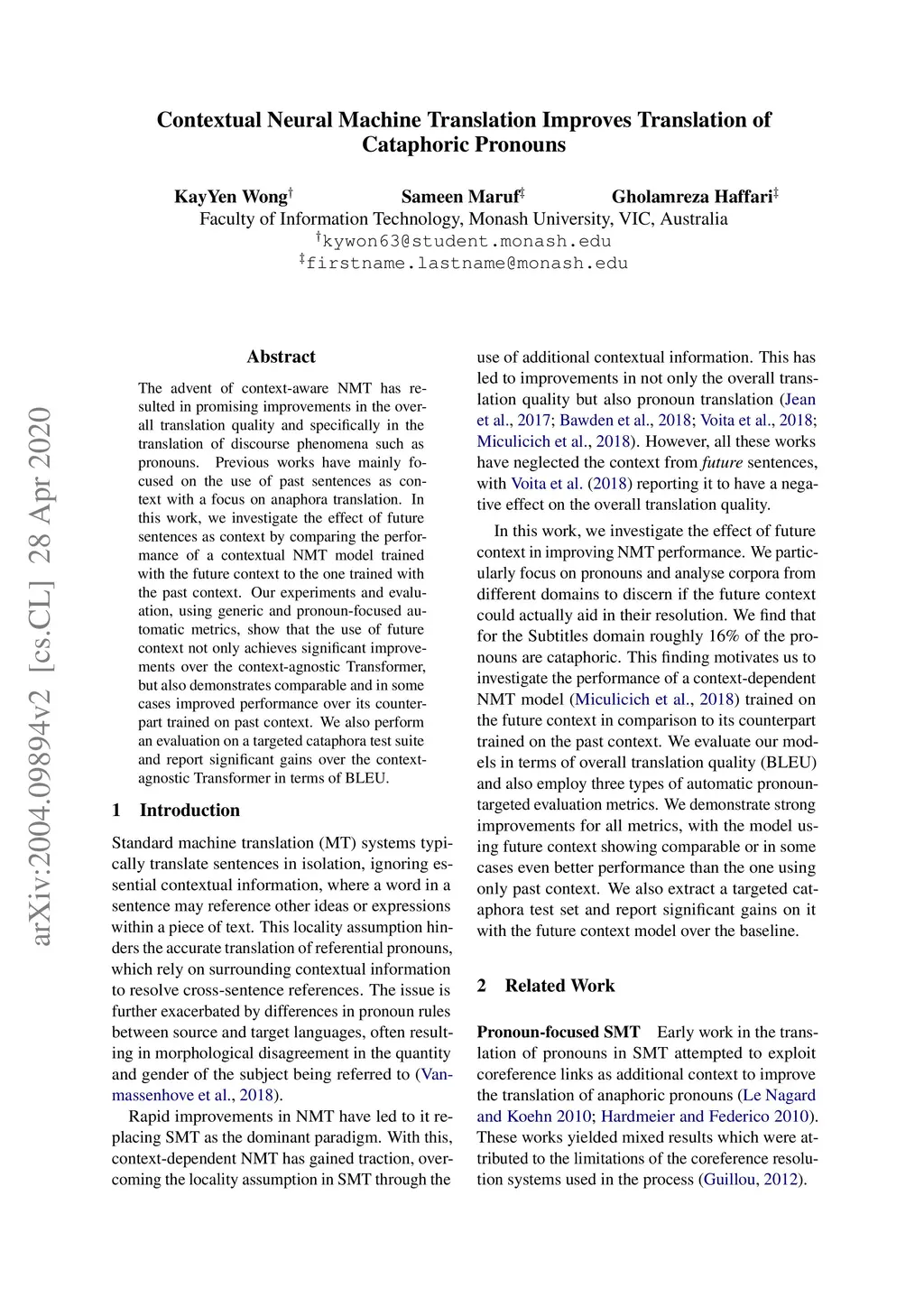 Contextual Neural Machine Translation Improves Translation of Cataphoric