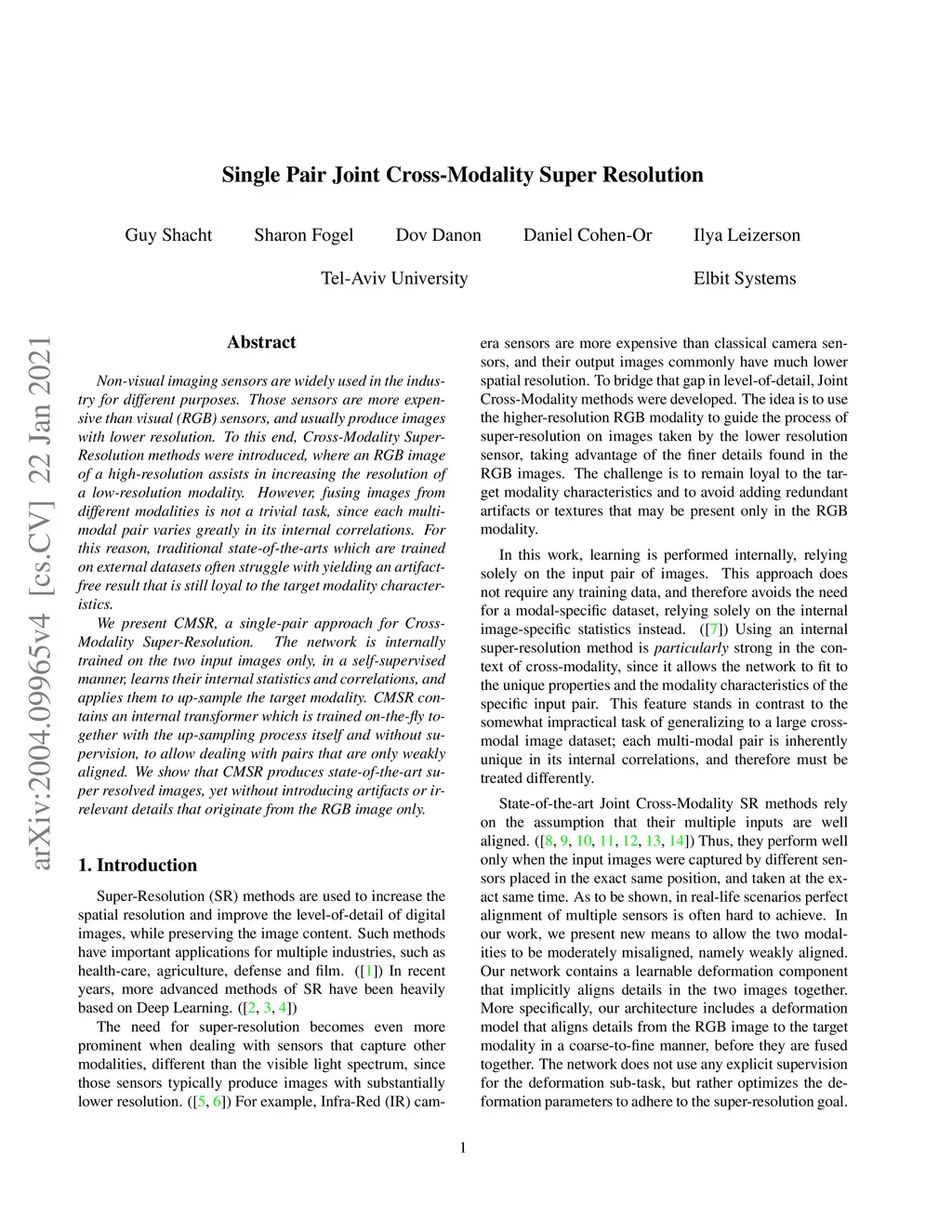 Non-visual imaging sensors are widely used in the industry for different purposes. Those sensors are more expensive than visual (RGB) sensors, and usually produce images with lower resolution. To this end, Cross-Modality Super-Resolution methods were introduced, where an RGB image of a high-resolution assists in increasing the resolution of the low-resolution modality. However, fusing images from different modalities is not a trivial task; the output must be artifact-free and remain loyal to the characteristics of the target modality. Moreover, the input images are never perfectly aligned, which results in further artifacts during the fusion process. We present CMSR, a deep network for Cross-Modality Super-Resolution, which unlike previous methods, is designed to deal with weakly aligned images. The network is trained on the two input images only, learns their internal statistics and correlations, and applies them to up-sample the target modality. CMSR contains an internal transformer that is trained on-the-fly together with the up-sampling process itself, without explicit supervision. We show that CMSR succeeds to increase the resolution of the input image, gaining valuable information from its RGB counterpart, yet in a conservative way, without introducing artifacts or irrelevant details.