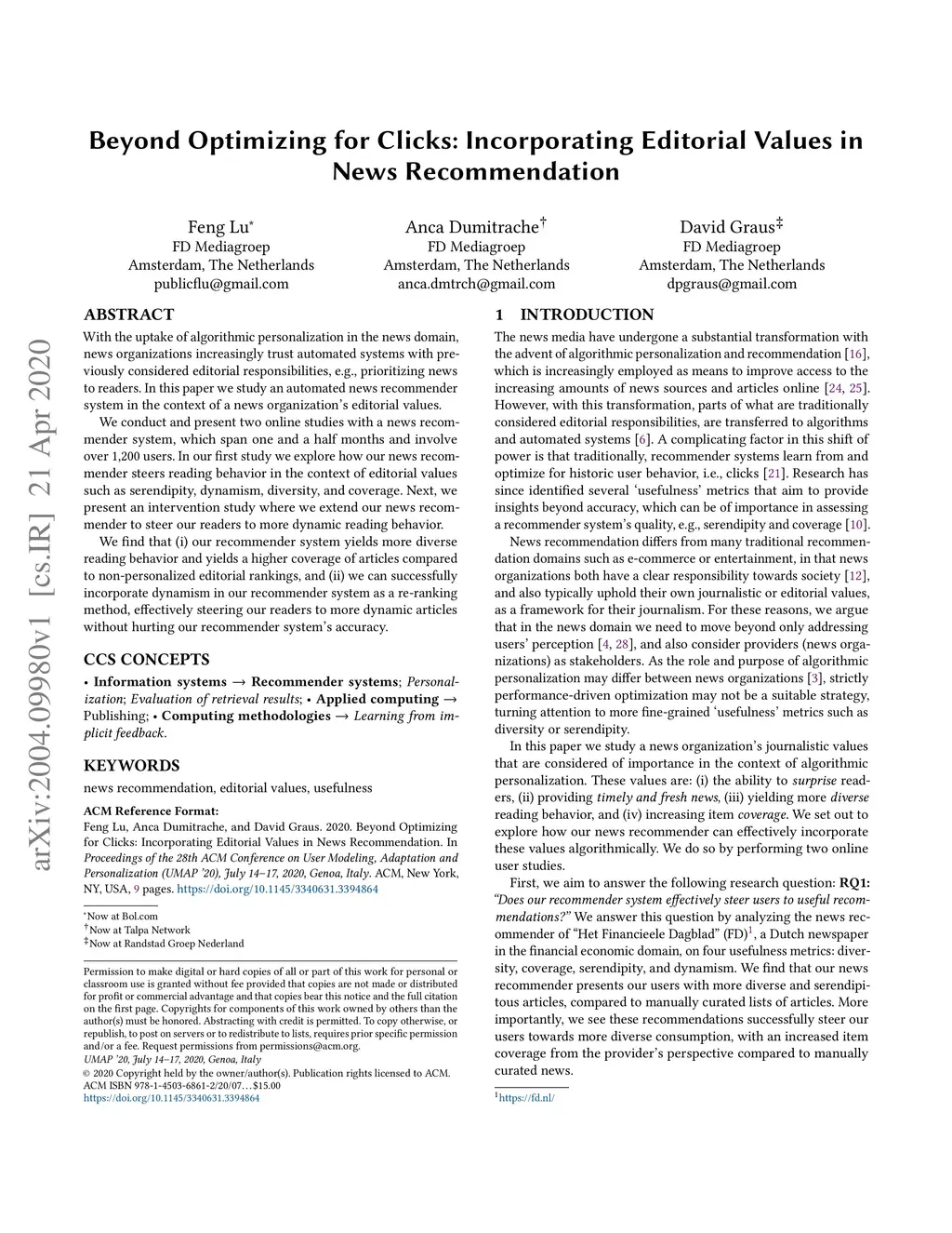 Beyond Optimizing for Clicks: Incorporating Editorial Values in News