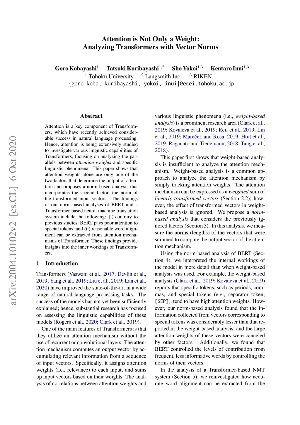 Attention is a key component of Transformers, which have recently achieved considerable success in natural language processing. Hence, attention is being extensively studied to investigate various linguistic capabilities of Transformers, focusing on analyzing the parallels between attention weights and specific linguistic phenomena. This paper shows that attention weights alone are only one of the two factors that determine the output of attention and proposes a norm-based analysis that incorporates the second factor, the norm of the transformed input vectors. The findings of our norm-based analyses of BERT and a Transformer-based neural machine translation system include the following: (i) contrary to previous studies, BERT pays poor attention to special tokens, and (ii) reasonable word alignment can be extracted from attention mechanisms of Transformer. These findings provide insights into the inner workings of Transformers.