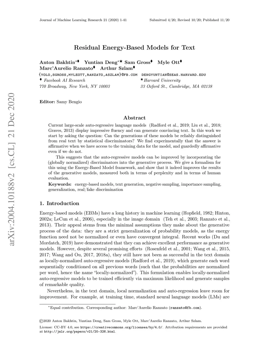 Current large-scale auto-regressive language models display impressive fluency and can generate convincing text. In this work we start by asking the question: Can the generations of these models be reliably distinguished from real text by statistical discriminators? We find experimentally that the answer is affirmative when we have access to the training data for the model, and guardedly affirmative even if we do not. This suggests that the auto-regressive models can be improved by incorporating the (globally normalized) discriminators into the generative process. We give a formalism for this using the Energy-Based Model framework, and show that it indeed improves the results of the generative models, measured both in terms of perplexity and in terms of human evaluation.