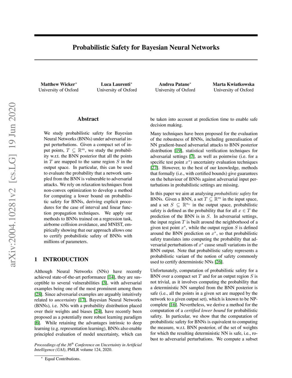 We study probabilistic safety for Bayesian Neural Networks (BNNs) under adversarial input perturbations. Given a compact set of input points, , we study the probability w.r.t. the BNN posterior that all the points in are mapped to the same region in the output space. In particular, this can be used to evaluate the probability that a network sampled from the BNN is vulnerable to adversarial attacks. We rely on relaxation techniques from non-convex optimization to develop a method for computing a lower bound on probabilistic safety for BNNs, deriving explicit procedures for the case of interval and linear function propagation techniques. We apply our methods to BNNs trained on a regression task, airborne collision avoidance, and MNIST, empirically showing that our approach allows one to certify probabilistic safety of BNNs with millions of parameters.