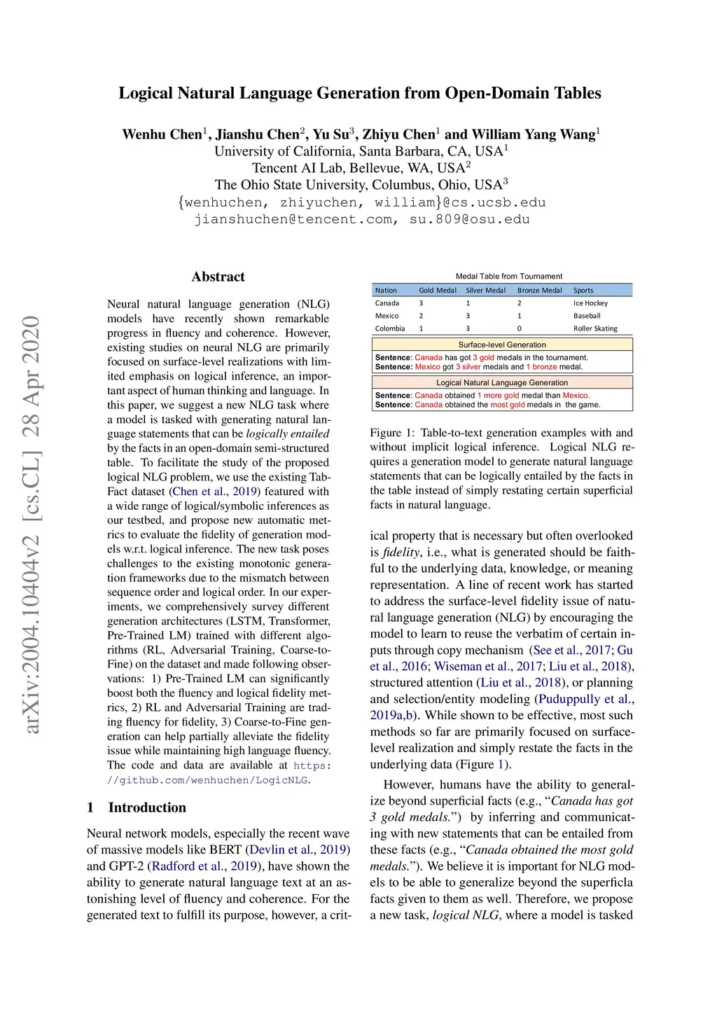 Neural natural language generation (NLG) models have recently shown remarkable progress in fluency and coherence. However, existing studies on neural NLG are primarily focused on surface-level realizations with limited emphasis on logical inference, an important aspect of human thinking and language. In this paper, we suggest a new NLG task where a model is tasked with generating natural language statements that can be \emph{logically entailed} by the facts in an open-domain semi-structured table. To facilitate the study of the proposed logical NLG problem, we use the existing TabFact dataset \cite{chen2019tabfact} featured with a wide range of logical/symbolic inferences as our testbed, and propose new automatic metrics to evaluate the fidelity of generation models w.r.t.\ logical inference. The new task poses challenges to the existing monotonic generation frameworks due to the mismatch between sequence order and logical order. In our experiments, we comprehensively survey different generation architectures (LSTM, Transformer, Pre-Trained LM) trained with different algorithms (RL, Adversarial Training, Coarse-to-Fine) on the dataset and made following observations: 1) Pre-Trained LM can significantly boost both the fluency and logical fidelity metrics, 2) RL and Adversarial Training are trading fluency for fidelity, 3) Coarse-to-Fine generation can help partially alleviate the fidelity issue while maintaining high language fluency. The code and data are available at \url{https://github.com/wenhuchen/LogicNLG}.