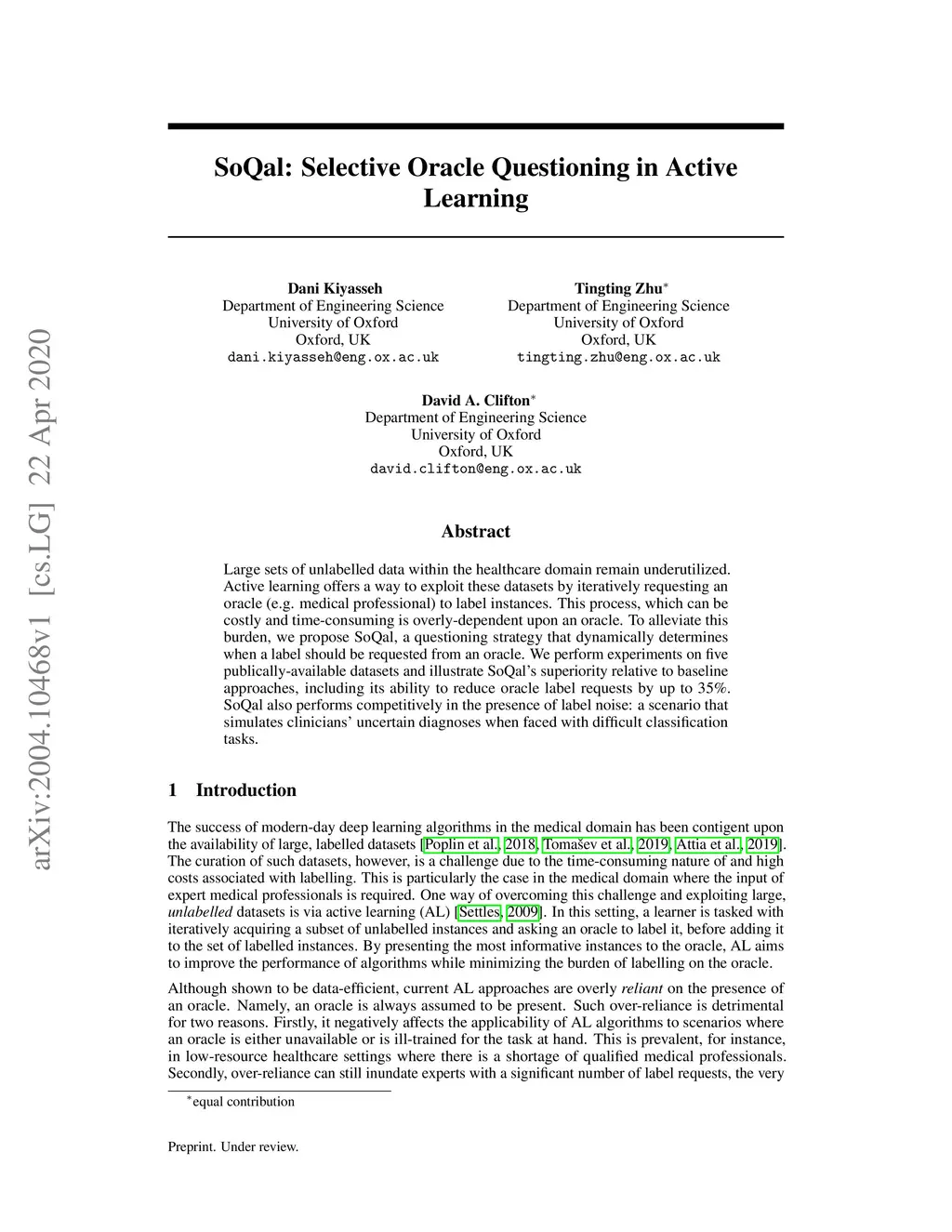 Large sets of unlabelled data within the healthcare domain remain underutilized. Active learning offers a way to exploit these datasets by iteratively requesting an oracle (e.g. medical professional) to label instances. This process, which can be costly and time-consuming is overly-dependent upon an oracle. To alleviate this burden, we propose SoQal, a questioning strategy that dynamically determines when a label should be requested from an oracle. We perform experiments on five publically-available datasets and illustrate SoQal's superiority relative to baseline approaches, including its ability to reduce oracle label requests by up to 35%. SoQal also performs competitively in the presence of label noise: a scenario that simulates clinicians' uncertain diagnoses when faced with difficult classification tasks.