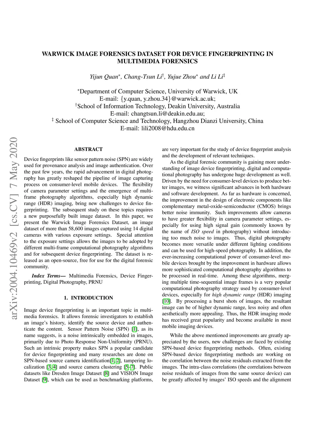 Warwick Image Forensics Dataset for Device Fingerprinting In Multimedia