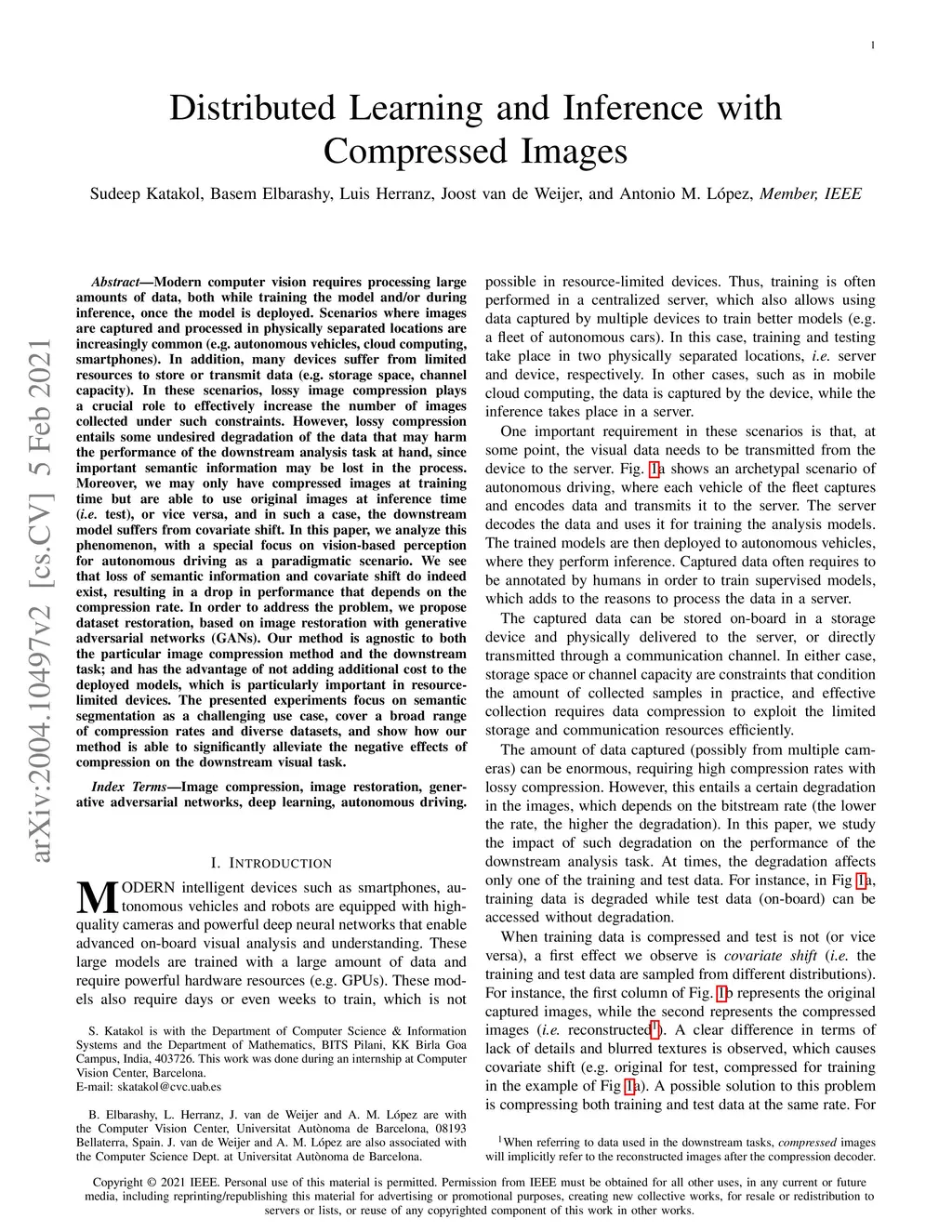 Modern computer vision requires processing large amounts of data, both while training the model and/or during inference, once the model is deployed. Scenarios where images are captured and processed in physically separated locations are increasingly common (e.g. autonomous vehicles, cloud computing). In addition, many devices suffer from limited resources to store or transmit data (e.g. storage space, channel capacity). In these scenarios, lossy image compression plays a crucial role to effectively increase the number of images collected under such constraints. However, lossy compression entails some undesired degradation of the data that may harm the performance of the downstream analysis task at hand, since important semantic information may be lost in the process. Moreover, we may only have compressed images at training time but are able to use original images at inference time, or vice versa, and in such a case, the downstream model suffers from covariate shift. In this paper, we analyze this phenomenon, with a special focus on vision-based perception for autonomous driving as a paradigmatic scenario. We see that loss of semantic information and covariate shift do indeed exist, resulting in a drop in performance that depends on the compression rate. In order to address the problem, we propose dataset restoration, based on image restoration with generative adversarial networks (GANs). Our method is agnostic to both the particular image compression method and the downstream task; and has the advantage of not adding additional cost to the deployed models, which is particularly important in resource-limited devices. The presented experiments focus on semantic segmentation as a challenging use case, cover a broad range of compression rates and diverse datasets, and show how our method is able to significantly alleviate the negative effects of compression on the downstream visual task.