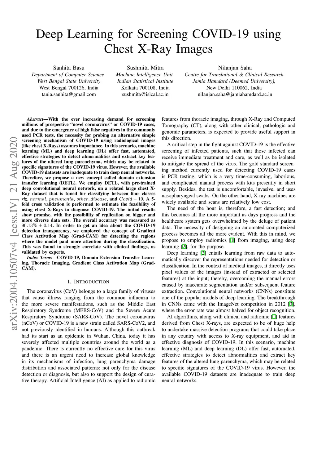 With the ever increasing demand for screening millions of prospective "novel coronavirus" or COVID-19 cases, and due to the emergence of high false negatives in the commonly used PCR tests, the necessity for probing an alternative simple screening mechanism of COVID-19 using radiological images (like chest X-Rays) assumes importance. In this scenario, machine learning (ML) and deep learning (DL) offer fast, automated, effective strategies to detect abnormalities and extract key features of the altered lung parenchyma, which may be related to specific signatures of the COVID-19 virus. However, the available COVID-19 datasets are inadequate to train deep neural networks. Therefore, we propose a new concept called domain extension transfer learning (DETL). We employ DETL, with pre-trained deep convolutional neural network, on a related large chest X-Ray dataset that is tuned for classifying between four classes \textit{viz.} , , and . A 5-fold cross validation is performed to estimate the feasibility of using chest X-Rays to diagnose COVID-19. The initial results show promise, with the possibility of replication on bigger and more diverse data sets. The overall accuracy was measured as . In order to get an idea about the COVID-19 detection transparency, we employed the concept of Gradient Class Activation Map (Grad-CAM) for detecting the regions where the model paid more attention during the classification. This was found to strongly correlate with clinical findings, as validated by experts.