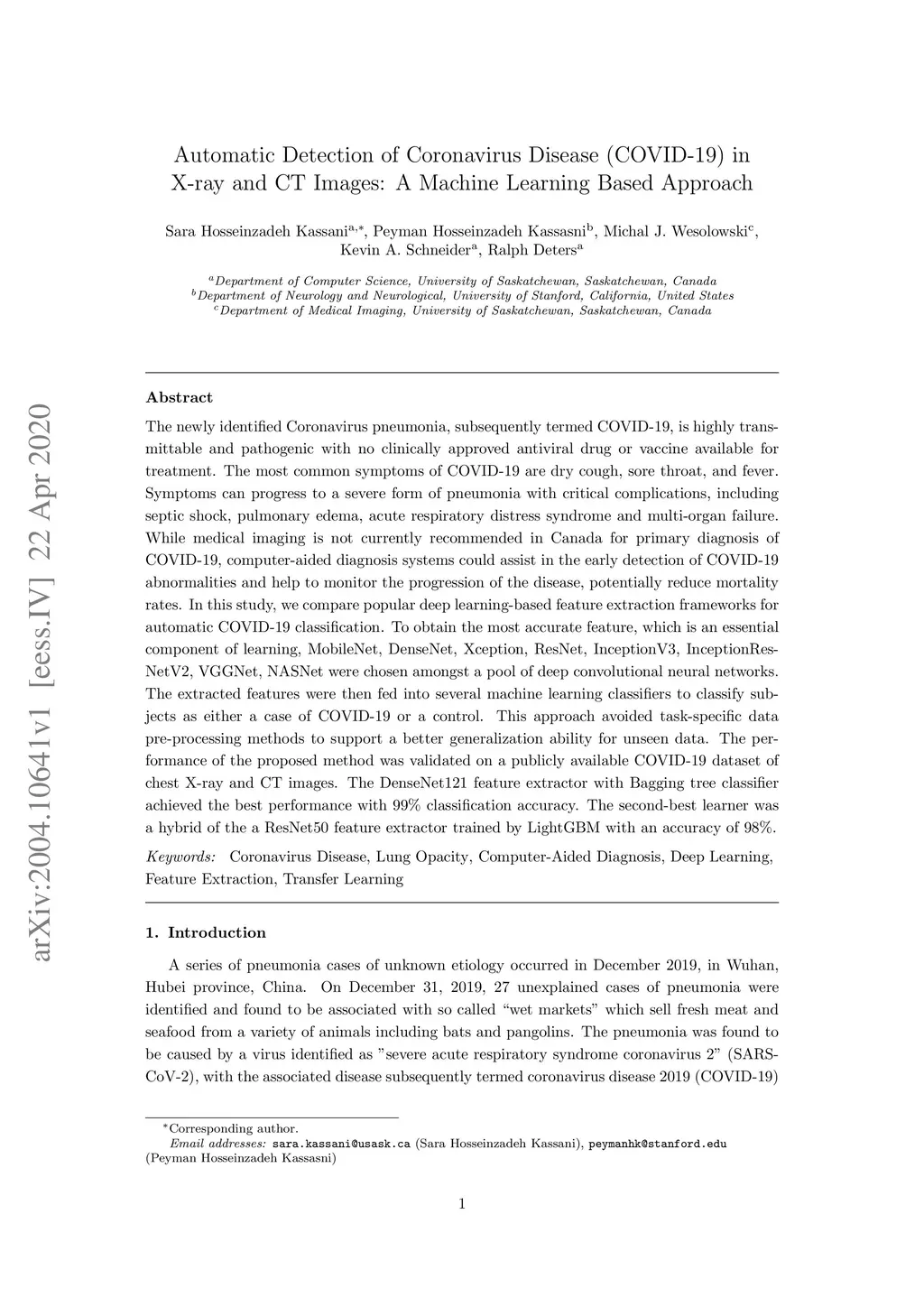 The newly identified Coronavirus pneumonia, subsequently termed COVID-19, is highly transmittable and pathogenic with no clinically approved antiviral drug or vaccine available for treatment. The most common symptoms of COVID-19 are dry cough, sore throat, and fever. Symptoms can progress to a severe form of pneumonia with critical complications, including septic shock, pulmonary edema, acute respiratory distress syndrome and multi-organ failure. While medical imaging is not currently recommended in Canada for primary diagnosis of COVID-19, computer-aided diagnosis systems could assist in the early detection of COVID-19 abnormalities and help to monitor the progression of the disease, potentially reduce mortality rates. In this study, we compare popular deep learning-based feature extraction frameworks for automatic COVID-19 classification. To obtain the most accurate feature, which is an essential component of learning, MobileNet, DenseNet, Xception, ResNet, InceptionV3, InceptionResNetV2, VGGNet, NASNet were chosen amongst a pool of deep convolutional neural networks. The extracted features were then fed into several machine learning classifiers to classify subjects as either a case of COVID-19 or a control. This approach avoided task-specific data pre-processing methods to support a better generalization ability for unseen data. The performance of the proposed method was validated on a publicly available COVID-19 dataset of chest X-ray and CT images. The DenseNet121 feature extractor with Bagging tree classifier achieved the best performance with 99% classification accuracy. The second-best learner was a hybrid of the a ResNet50 feature extractor trained by LightGBM with an accuracy of 98%.