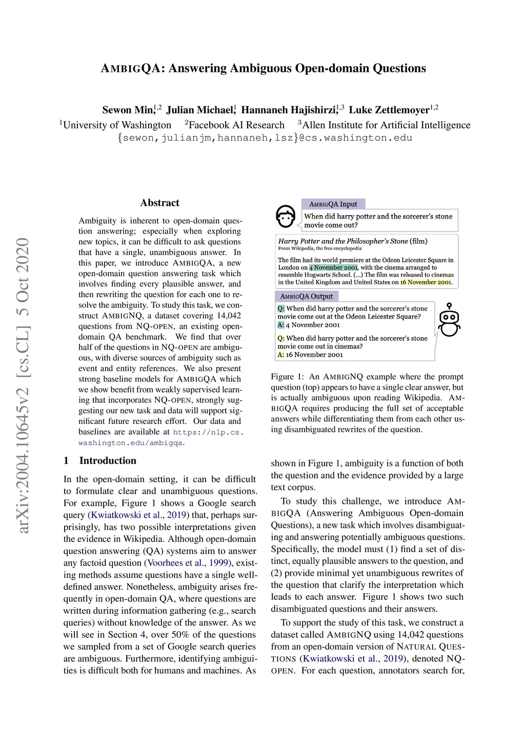 Ambiguity is inherent to open-domain question answering; especially when exploring new topics, it can be difficult to ask questions that have a single, unambiguous answer. In this paper, we introduce AmbigQA, a new open-domain question answering task which involves finding every plausible answer, and then rewriting the question for each one to resolve the ambiguity. To study this task, we construct AmbigNQ, a dataset covering 14,042 questions from NQ-open, an existing open-domain QA benchmark. We find that over half of the questions in NQ-open are ambiguous, with diverse sources of ambiguity such as event and entity references. We also present strong baseline models for AmbigQA which we show benefit from weakly supervised learning that incorporates NQ-open, strongly suggesting our new task and data will support significant future research effort. Our data and baselines are available at https://nlp.cs.washington.edu/ambigqa.