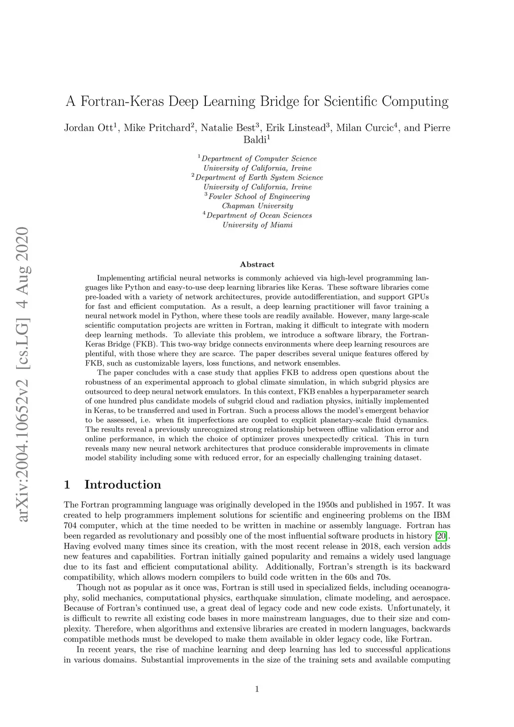 Implementing artificial neural networks is commonly achieved via high-level programming languages like Python and easy-to-use deep learning libraries like Keras. These software libraries come pre-loaded with a variety of network architectures, provide autodifferentiation, and support GPUs for fast and efficient computation. As a result, a deep learning practitioner will favor training a neural network model in Python, where these tools are readily available. However, many large-scale scientific computation projects are written in Fortran, making it difficult to integrate with modern deep learning methods. To alleviate this problem, we introduce a software library, the Fortran-Keras Bridge (FKB). This two-way bridge connects environments where deep learning resources are plentiful, with those where they are scarce. The paper describes several unique features offered by FKB, such as customizable layers, loss functions, and network ensembles. The paper concludes with a case study that applies FKB to address open questions about the robustness of an experimental approach to global climate simulation, in which subgrid physics are outsourced to deep neural network emulators. In this context, FKB enables a hyperparameter search of one hundred plus candidate models of subgrid cloud and radiation physics, initially implemented in Keras, to be transferred and used in Fortran. Such a process allows the model's emergent behavior to be assessed, i.e. when fit imperfections are coupled to explicit planetary-scale fluid dynamics. The results reveal a previously unrecognized strong relationship between offline validation error and online performance, in which the choice of optimizer proves unexpectedly critical. This reveals many neural network architectures that produce considerable improvements in stability including some with reduced error, for an especially challenging training dataset.