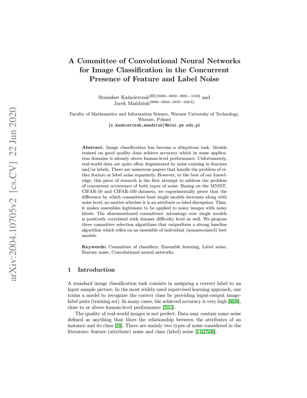 Image classification has become a ubiquitous task. Models trained on good quality data achieve accuracy which in some application domains is already above human-level performance. Unfortunately, real-world data are quite often degenerated by the noise existing in features and/or labels. There are quite many papers that handle the problem of either feature or label noise, separately. However, to the best of our knowledge, this piece of research is the first attempt to address the problem of concurrent occurrence of both types of noise. Basing on the MNIST, CIFAR-10 and CIFAR-100 datasets, we experimentally proved that the difference by which committees beat single models increases along with noise level, no matter it is an attribute or label disruption. Thus, it makes ensembles legitimate to be applied to noisy images with noisy labels. The aforementioned committees' advantage over single models is positively correlated with dataset difficulty level as well. We propose three committee selection algorithms that outperform a strong baseline algorithm which relies on an ensemble of individual (nonassociated) best models.