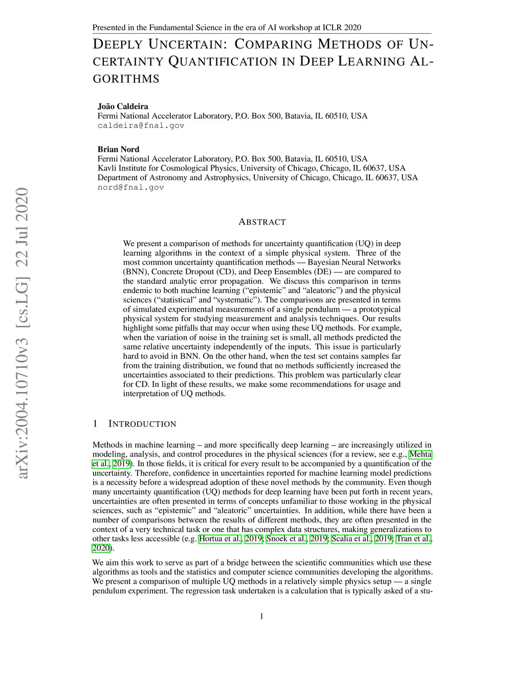 We present a comparison of methods for uncertainty quantification (UQ) in deep learning algorithms in the context of a simple physical system. Three of the most common uncertainty quantification methods - Bayesian Neural Networks (BNN), Concrete Dropout (CD), and Deep Ensembles (DE) - are compared to the standard analytic error propagation. We discuss this comparison in terms endemic to both machine learning ("epistemic" and "aleatoric") and the physical sciences ("statistical" and "systematic"). The comparisons are presented in terms of simulated experimental measurements of a single pendulum - a prototypical physical system for studying measurement and analysis techniques. Our results highlight some pitfalls that may occur when using these UQ methods. For example, when the variation of noise in the training set is small, all methods predicted the same relative uncertainty independently of the inputs. This issue is particularly hard to avoid in BNN. On the other hand, when the test set contains samples far from the training distribution, we found that no methods sufficiently increased the uncertainties associated to their predictions. This problem was particularly clear for CD. In light of these results, we make some recommendations for usage and interpretation of UQ methods.