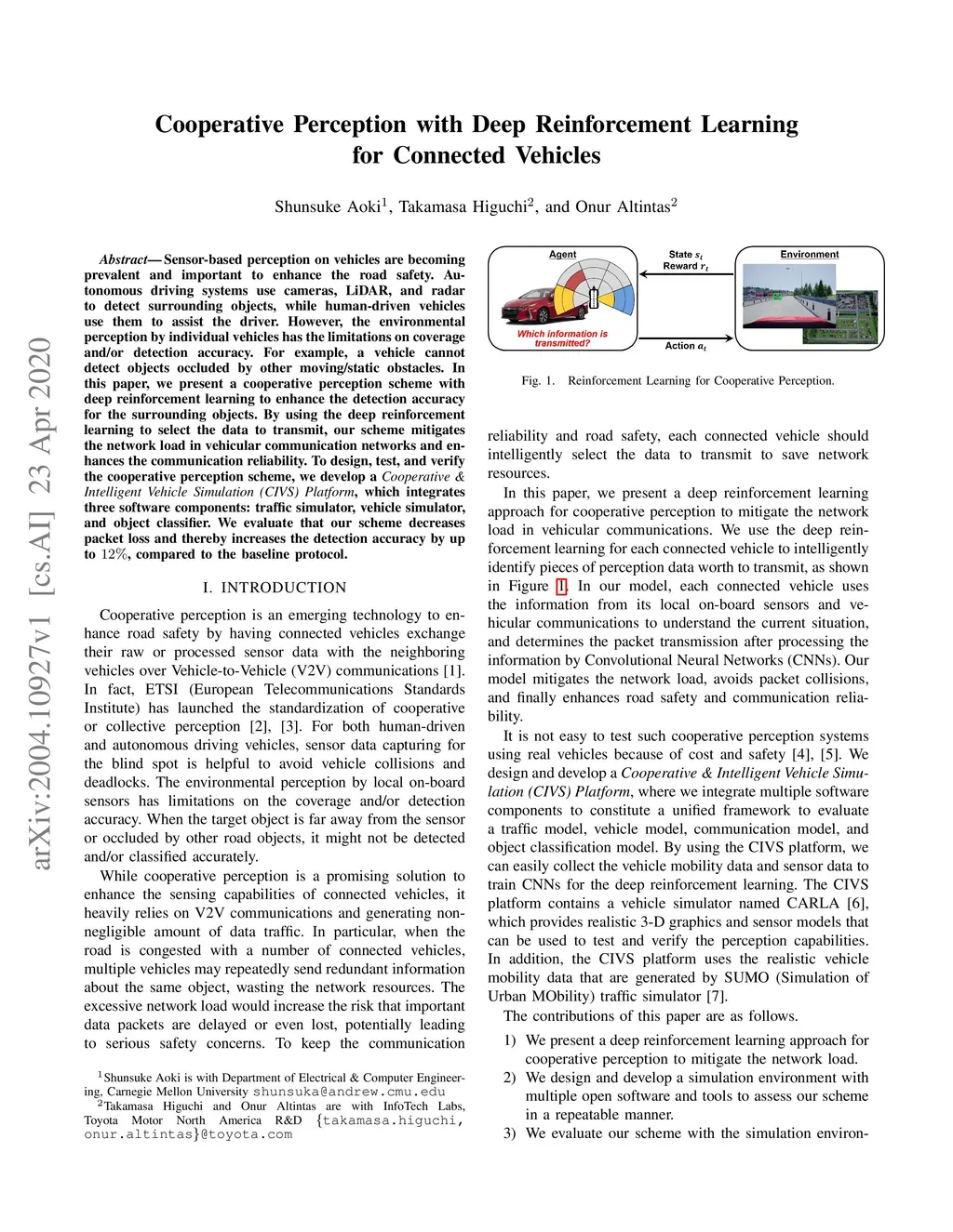 Sensor-based perception on vehicles are becoming prevalent and important to enhance the road safety. Autonomous driving systems use cameras, LiDAR, and radar to detect surrounding objects, while human-driven vehicles use them to assist the driver. However, the environmental perception by individual vehicles has the limitations on coverage and/or detection accuracy. For example, a vehicle cannot detect objects occluded by other moving/static obstacles. In this paper, we present a cooperative perception scheme with deep reinforcement learning to enhance the detection accuracy for the surrounding objects. By using the deep reinforcement learning to select the data to transmit, our scheme mitigates the network load in vehicular communication networks and enhances the communication reliability. To design, test, and verify the cooperative perception scheme, we develop a Cooperative & Intelligent Vehicle Simulation (CIVS) Platform, which integrates three software components: traffic simulator, vehicle simulator, and object classifier. We evaluate that our scheme decreases packet loss and thereby increases the detection accuracy by up to 12%, compared to the baseline protocol.