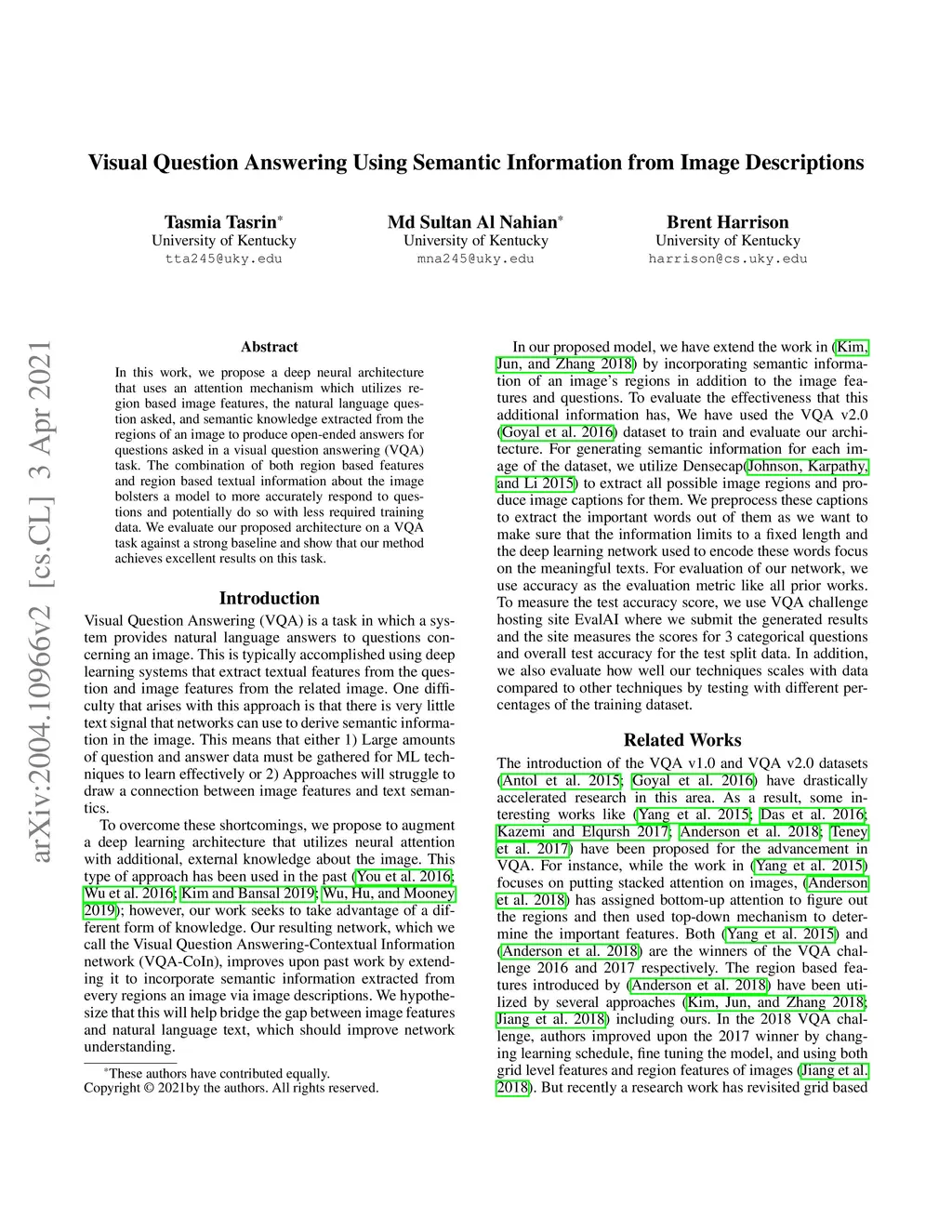 In this work, we propose a deep neural architecture that uses an attention mechanism which utilizes region based image features, the natural language question asked, and semantic knowledge extracted from the regions of an image to produce open-ended answers for questions asked in a visual question answering (VQA) task. The combination of both region based features and region based textual information about the image bolsters a model to more accurately respond to questions and potentially do so with less required training data. We evaluate our proposed architecture on a VQA task against a strong baseline and show that our method achieves excellent results on this task.