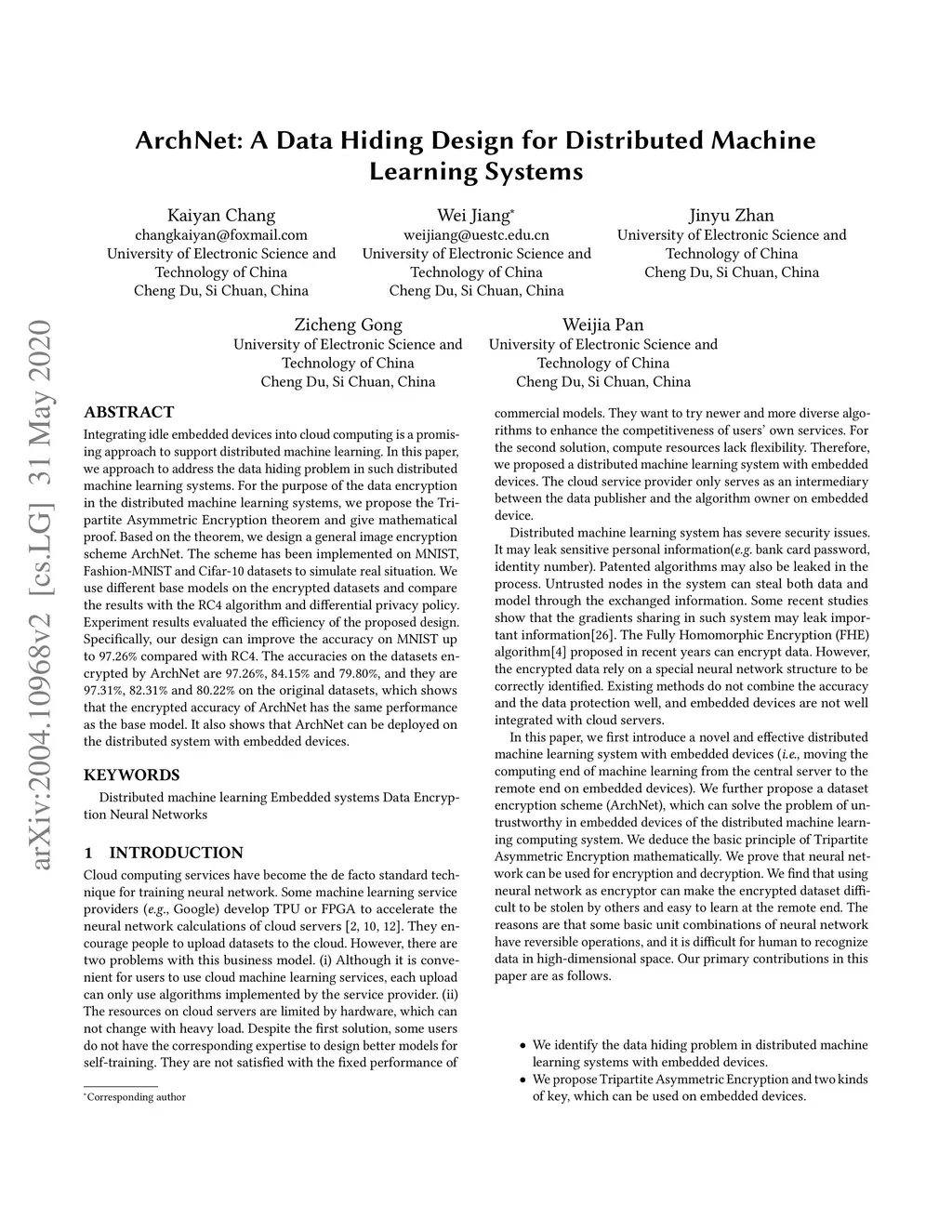 Integrating idle embedded devices into cloud computing is a promising approach to support distributed machine learning. In this paper, we approach to address the data hiding problem in such distributed machine learning systems. For the purpose of the data encryption in the distributed machine learning systems, we propose the Tripartite Asymmetric Encryption theorem and give mathematical proof. Based on the theorem, we design a general image encryption scheme ArchNet.The scheme has been implemented on MNIST, Fashion-MNIST and Cifar-10 datasets to simulate real situation. We use different base models on the encrypted datasets and compare the results with the RC4 algorithm and differential privacy policy. Experiment results evaluated the efficiency of the proposed design. Specifically, our design can improve the accuracy on MNIST up to 97.26% compared with RC4.The accuracies on the datasets encrypted by ArchNet are 97.26%, 84.15% and 79.80%, and they are 97.31%, 82.31% and 80.22% on the original datasets, which shows that the encrypted accuracy of ArchNet has the same performance as the base model. It also shows that ArchNet can be deployed on the distributed system with embedded devices.