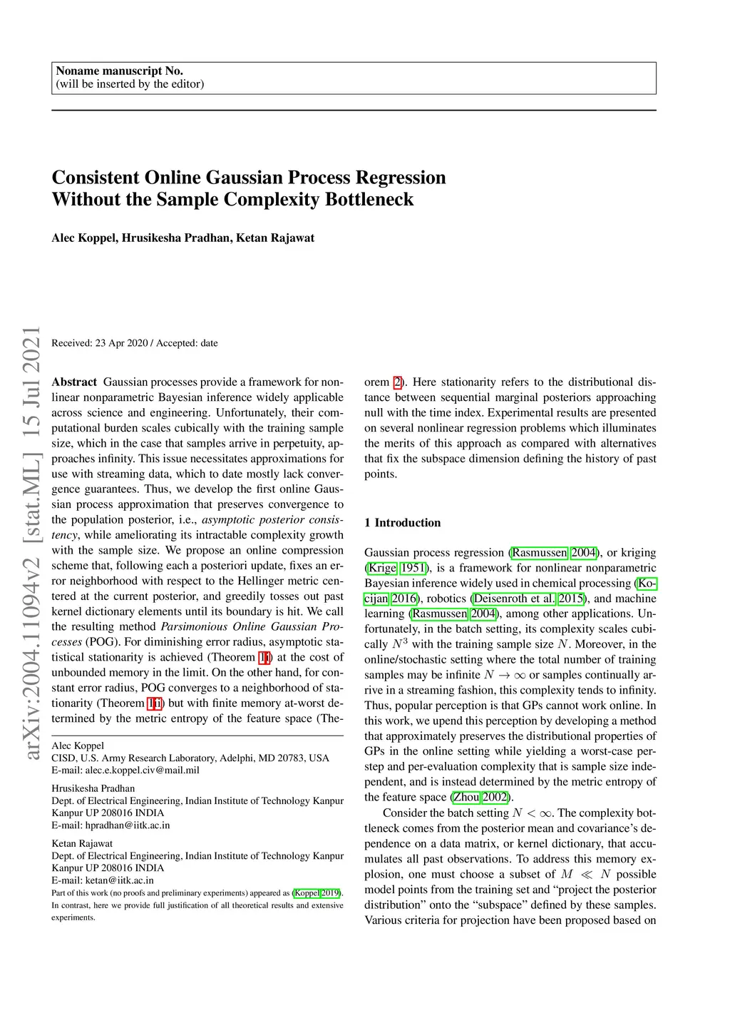 Gaussian processes provide a framework for nonlinear nonparametric Bayesian inference widely applicable across science and engineering. Unfortunately, their computational burden scales cubically with the training sample size, which in the case that samples arrive in perpetuity, approaches infinity. This issue necessitates approximations for use with streaming data, which to date mostly lack convergence guarantees. Thus, we develop the first online Gaussian process approximation that preserves convergence to the population posterior, i.e., asymptotic posterior consistency, while ameliorating its intractable complexity growth with the sample size. We propose an online compression scheme that, following each a posteriori update, fixes an error neighborhood with respect to the Hellinger metric centered at the current posterior, and greedily tosses out past kernel dictionary elements until its boundary is hit. We call the resulting method Parsimonious Online Gaussian Processes (POG). For diminishing error radius, exact asymptotic consistency is preserved (Theorem 1(i)) at the cost of unbounded memory in the limit. On the other hand, for constant error radius, POG converges to a neighborhood of the population posterior (Theorem 1(ii))but with finite memory at-worst determined by the metric entropy of the feature space (Theorem 2). Experimental results are presented on several nonlinear regression problems which illuminates the merits of this approach as compared with alternatives that fix the subspace dimension defining the history of past points.