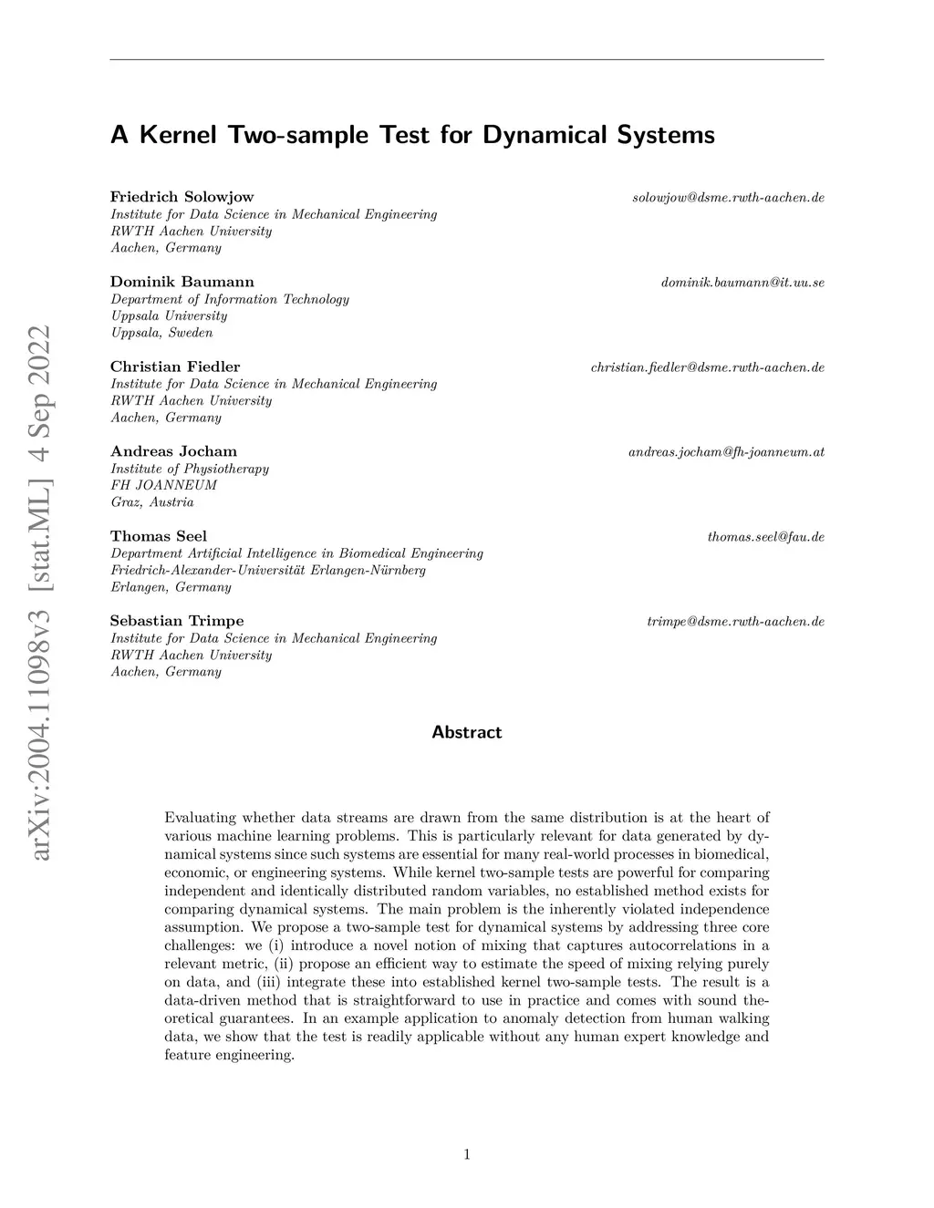 Evaluating whether data streams were generated by the same distribution is at the heart of many machine learning problems, e.g. to detect changes. This is particularly relevant for data generated by dynamical systems since they are essential for many real-world processes in biomedical, economic, or engineering systems. While kernel two-sample tests are powerful for comparing independent and identically distributed random variables, no established method exists for comparing dynamical systems. The key problem is the critical independence assumption, which is inherently violated in dynamical systems. We propose a novel two-sample test for dynamical systems by addressing three core challenges: we (i) introduce a novel notion of mixing that captures autocorrelations in a relevant metric, (ii) propose an efficient way to estimate the speed of mixing purely from data, and (iii) integrate these into established kernel-two sample tests. The result is a data-driven method for comparison of dynamical systems that is easy to use in practice and comes with sound theoretical guarantees. In an example application to anomaly detection from human walking data, we show that the test readily applies without the need for feature engineering, heuristics, and human expert knowledge.