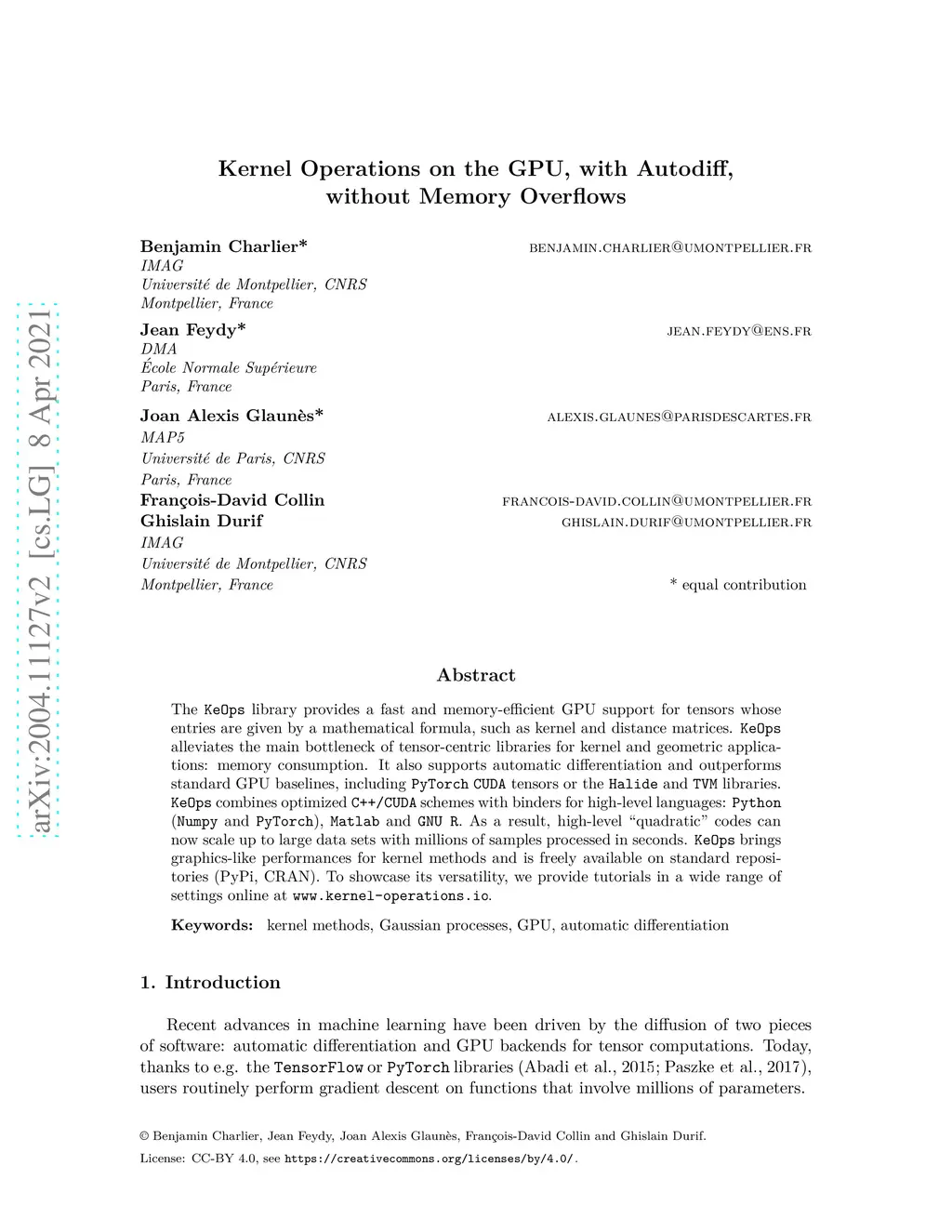 The KeOps library provides a fast and memory-efficient GPU support for tensors whose entries are given by a mathematical formula, such as kernel and distance matrices. KeOps alleviates the major bottleneck of tensor-centric libraries for kernel and geometric applications: memory consumption. It also supports automatic differentiation and outperforms standard GPU baselines, including PyTorch CUDA tensors or the Halide and TVM libraries. KeOps combines optimized C++/CUDA schemes with binders for high-level languages: Python (Numpy and PyTorch), Matlab and GNU R. As a result, high-level "quadratic" codes can now scale up to large data sets with millions of samples processed in seconds. KeOps brings graphics-like performances for kernel methods and is freely available on standard repositories (PyPi, CRAN). To showcase its versatility, we provide tutorials in a wide range of settings online at \url{www.kernel-operations.io}.