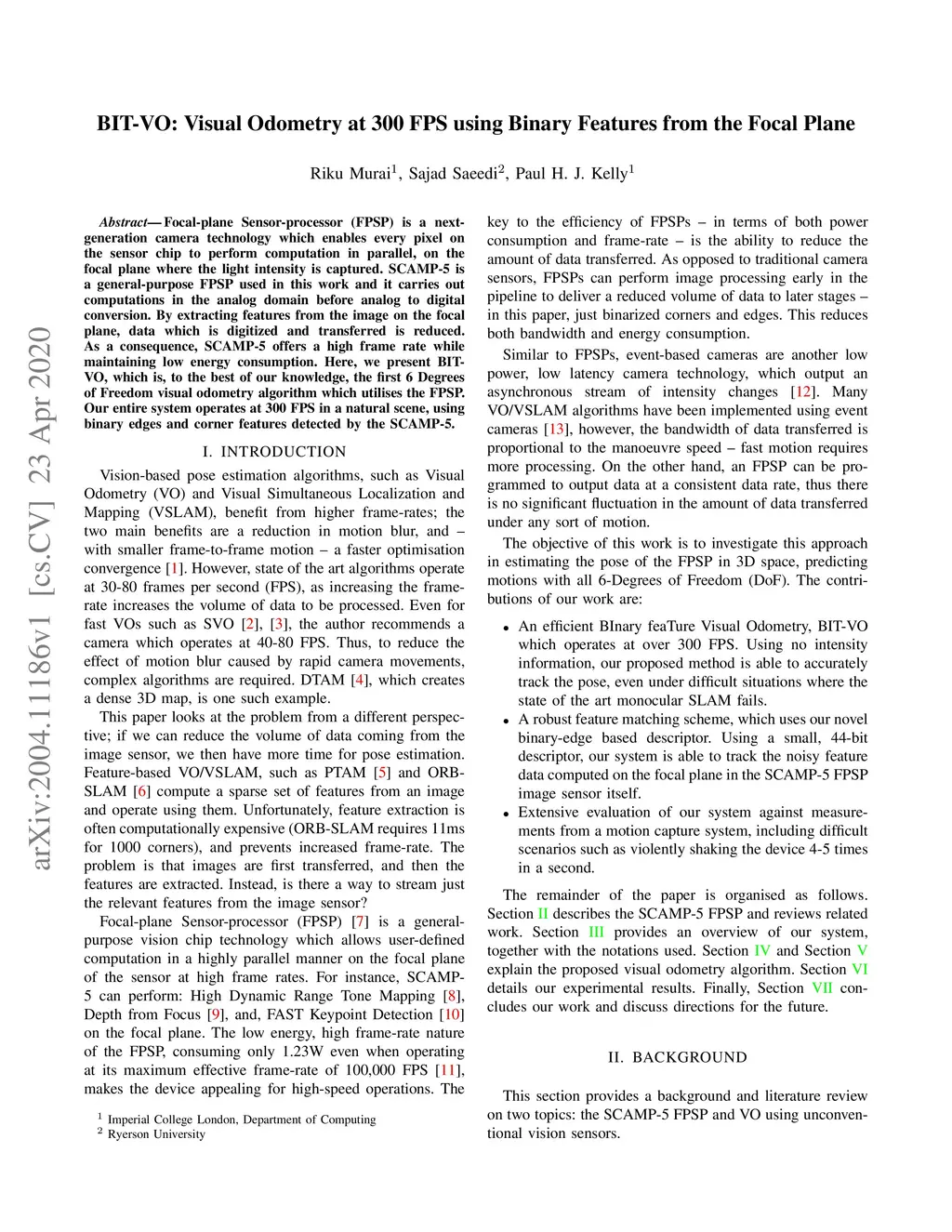 Focal-plane Sensor-processor (FPSP) is a next-generation camera technology which enables every pixel on the sensor chip to perform computation in parallel, on the focal plane where the light intensity is captured. SCAMP-5 is a general-purpose FPSP used in this work and it carries out computations in the analog domain before analog to digital conversion. By extracting features from the image on the focal plane, data which is digitized and transferred is reduced. As a consequence, SCAMP-5 offers a high frame rate while maintaining low energy consumption. Here, we present BIT-VO, which is, to the best of our knowledge, the first 6 Degrees of Freedom visual odometry algorithm which utilises the FPSP. Our entire system operates at 300 FPS in a natural scene, using binary edges and corner features detected by the SCAMP-5.