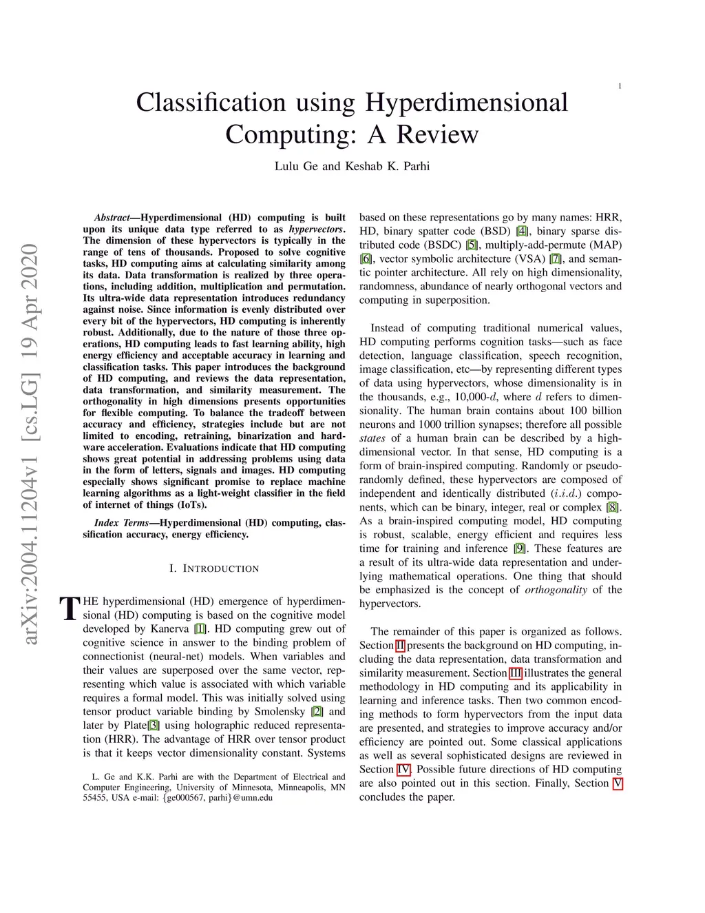 Hyperdimensional (HD) computing is built upon its unique data type referred to as hypervectors. The dimension of these hypervectors is typically in the range of tens of thousands. Proposed to solve cognitive tasks, HD computing aims at calculating similarity among its data. Data transformation is realized by three operations, including addition, multiplication and permutation. Its ultra-wide data representation introduces redundancy against noise. Since information is evenly distributed over every bit of the hypervectors, HD computing is inherently robust. Additionally, due to the nature of those three operations, HD computing leads to fast learning ability, high energy efficiency and acceptable accuracy in learning and classification tasks. This paper introduces the background of HD computing, and reviews the data representation, data transformation, and similarity measurement. The orthogonality in high dimensions presents opportunities for flexible computing. To balance the tradeoff between accuracy and efficiency, strategies include but are not limited to encoding, retraining, binarization and hardware acceleration. Evaluations indicate that HD computing shows great potential in addressing problems using data in the form of letters, signals and images. HD computing especially shows significant promise to replace machine learning algorithms as a light-weight classifier in the field of internet of things (IoTs).