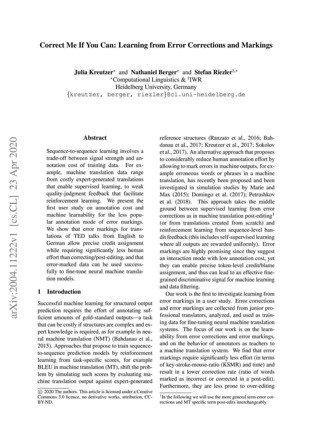Sequence-to-sequence learning involves a trade-off between signal strength and annotation cost of training data. For example, machine translation data range from costly expert-generated translations that enable supervised learning, to weak quality-judgment feedback that facilitate reinforcement learning. We present the first user study on annotation cost and machine learnability for the less popular annotation mode of error markings. We show that error markings for translations of TED talks from English to German allow precise credit assignment while requiring significantly less human effort than correcting/post-editing, and that error-marked data can be used successfully to fine-tune neural machine translation models.