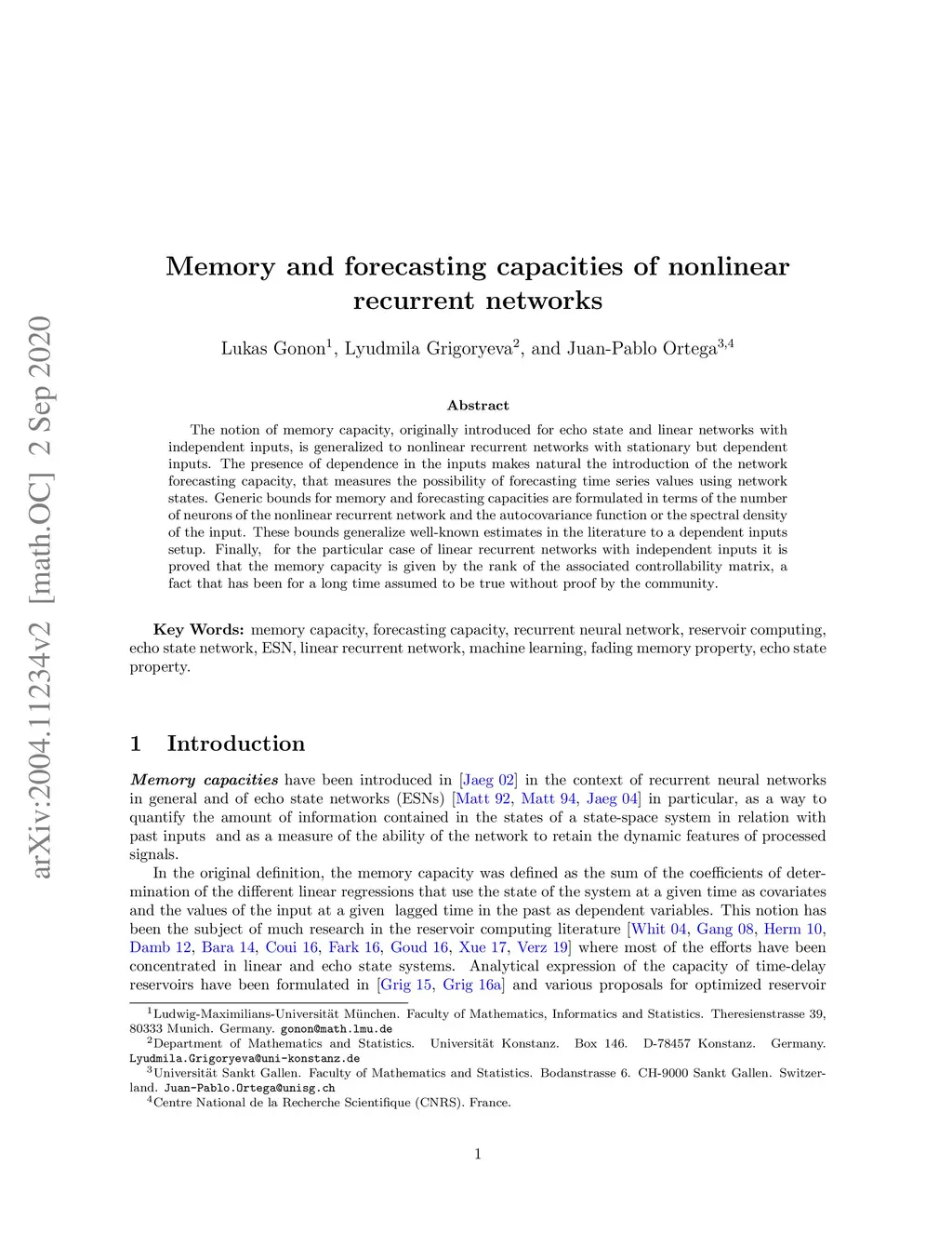 The notion of memory capacity, originally introduced for echo state and linear networks with independent inputs, is generalized to nonlinear recurrent networks with stationary but dependent inputs. The presence of dependence in the inputs makes natural the introduction of the network forecasting capacity, that measures the possibility of forecasting time series values using network states. Generic bounds for memory and forecasting capacities are formulated in terms of the number of neurons of the nonlinear recurrent network and the autocovariance function or the spectral density of the input. These bounds generalize well-known estimates in the literature to a dependent inputs setup. Finally, for the particular case of linear recurrent networks with independent inputs it is proved that the memory capacity is given by the rank of the associated controllability matrix, a fact that has been for a long time assumed to be true without proof by the community.