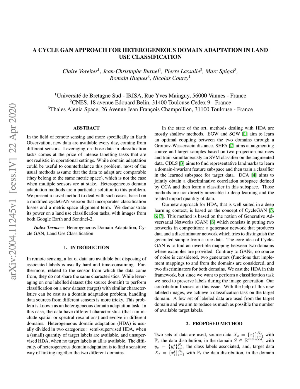 In the field of remote sensing and more specifically in Earth Observation, new data are available every day, coming from different sensors. Leveraging on those data in classification tasks comes at the price of intense labelling tasks that are not realistic in operational settings. While domain adaptation could be useful to counterbalance this problem, most of the usual methods assume that the data to adapt are comparable (they belong to the same metric space), which is not the case when multiple sensors are at stake. Heterogeneous domain adaptation methods are a particular solution to this problem. We present a novel method to deal with such cases, based on a modified cycleGAN version that incorporates classification losses and a metric space alignment term. We demonstrate its power on a land use classification tasks, with images from both Google Earth and Sentinel-2.