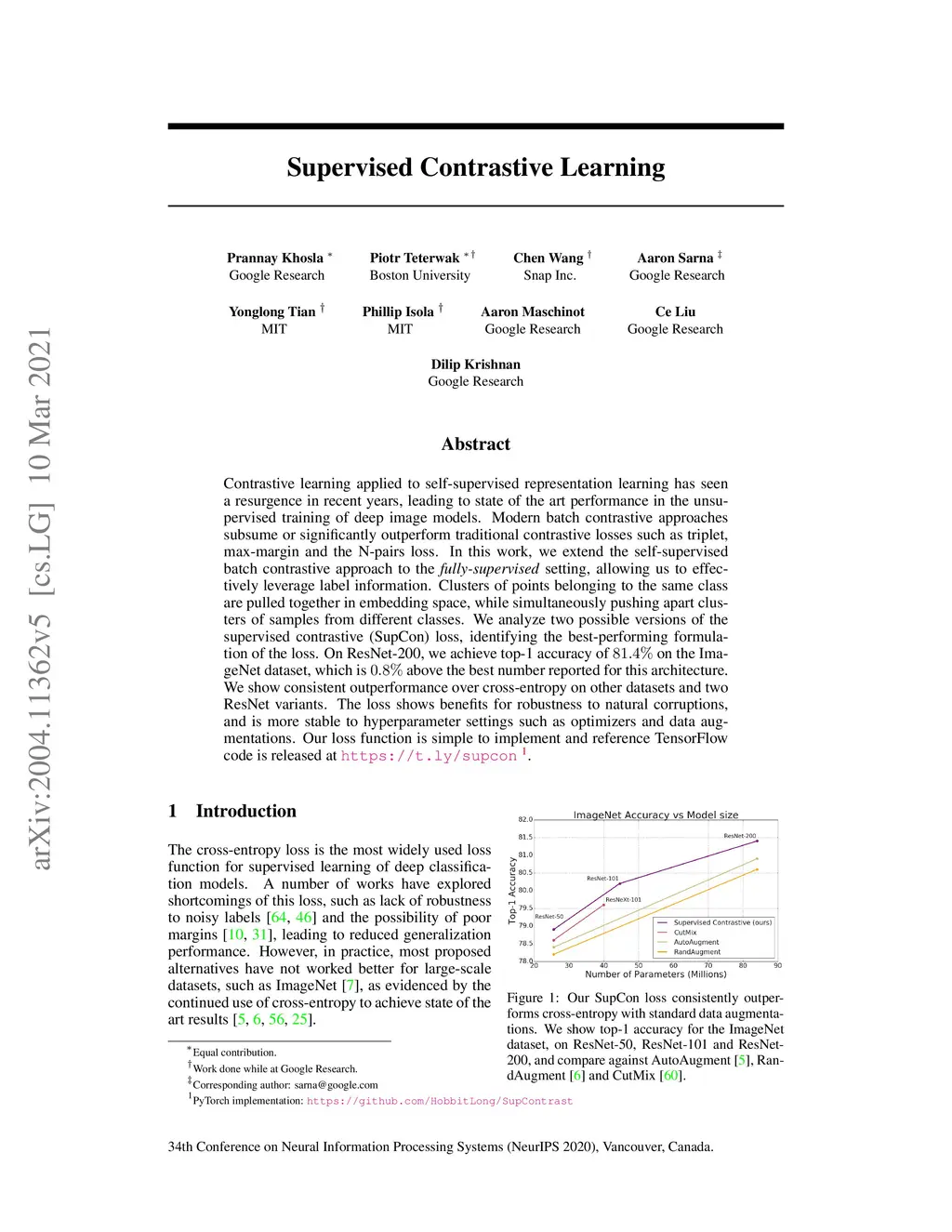 Contrastive learning applied to self-supervised representation learning has seen a resurgence in recent years, leading to state of the art performance in the unsupervised training of deep image models. Modern batch contrastive approaches subsume or significantly outperform traditional contrastive losses such as triplet, max-margin and the N-pairs loss. In this work, we extend the self-supervised batch contrastive approach to the fully-supervised setting, allowing us to effectively leverage label information. Clusters of points belonging to the same class are pulled together in embedding space, while simultaneously pushing apart clusters of samples from different classes. We analyze two possible versions of the supervised contrastive (SupCon) loss, identifying the best-performing formulation of the loss. On ResNet-200, we achieve top-1 accuracy of 81.4% on the ImageNet dataset, which is 0.8% above the best number reported for this architecture. We show consistent outperformance over cross-entropy on other datasets and two ResNet variants. The loss shows benefits for robustness to natural corruptions and is more stable to hyperparameter settings such as optimizers and data augmentations. Our loss function is simple to implement, and reference TensorFlow code is released at https://t.ly/supcon.
