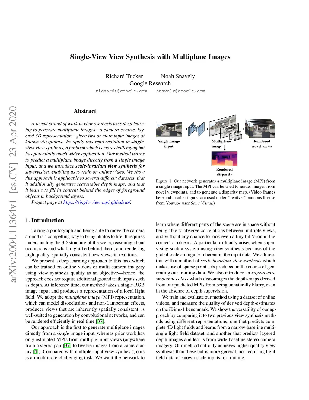 A recent strand of work in view synthesis uses deep learning to generate multiplane images (a camera-centric, layered 3D representation) given two or more input images at known viewpoints. We apply this representation to single-view view synthesis, a problem which is more challenging but has potentially much wider application. Our method learns to predict a multiplane image directly from a single image input, and we introduce scale-invariant view synthesis for supervision, enabling us to train on online video. We show this approach is applicable to several different datasets, that it additionally generates reasonable depth maps, and that it learns to fill in content behind the edges of foreground objects in background layers. Project page at https://single-view-mpi.github.io/.