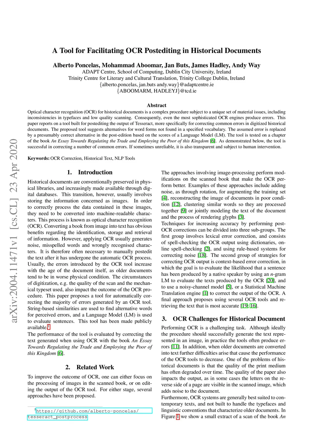 Optical character recognition (OCR) for historical documents is a complex procedure subject to a unique set of material issues, including inconsistencies in typefaces and low quality scanning. Consequently, even the most sophisticated OCR engines produce errors. This paper reports on a tool built for postediting the output of Tesseract, more specifically for correcting common errors in digitized historical documents. The proposed tool suggests alternatives for word forms not found in a specified vocabulary. The assumed error is replaced by a presumably correct alternative in the post-edition based on the scores of a Language Model (LM). The tool is tested on a chapter of the book An Essay Towards Regulating the Trade and Employing the Poor of this Kingdom (Cary ,1719). As demonstrated below, the tool is successful in correcting a number of common errors. If sometimes unreliable, it is also transparent and subject to human intervention.
