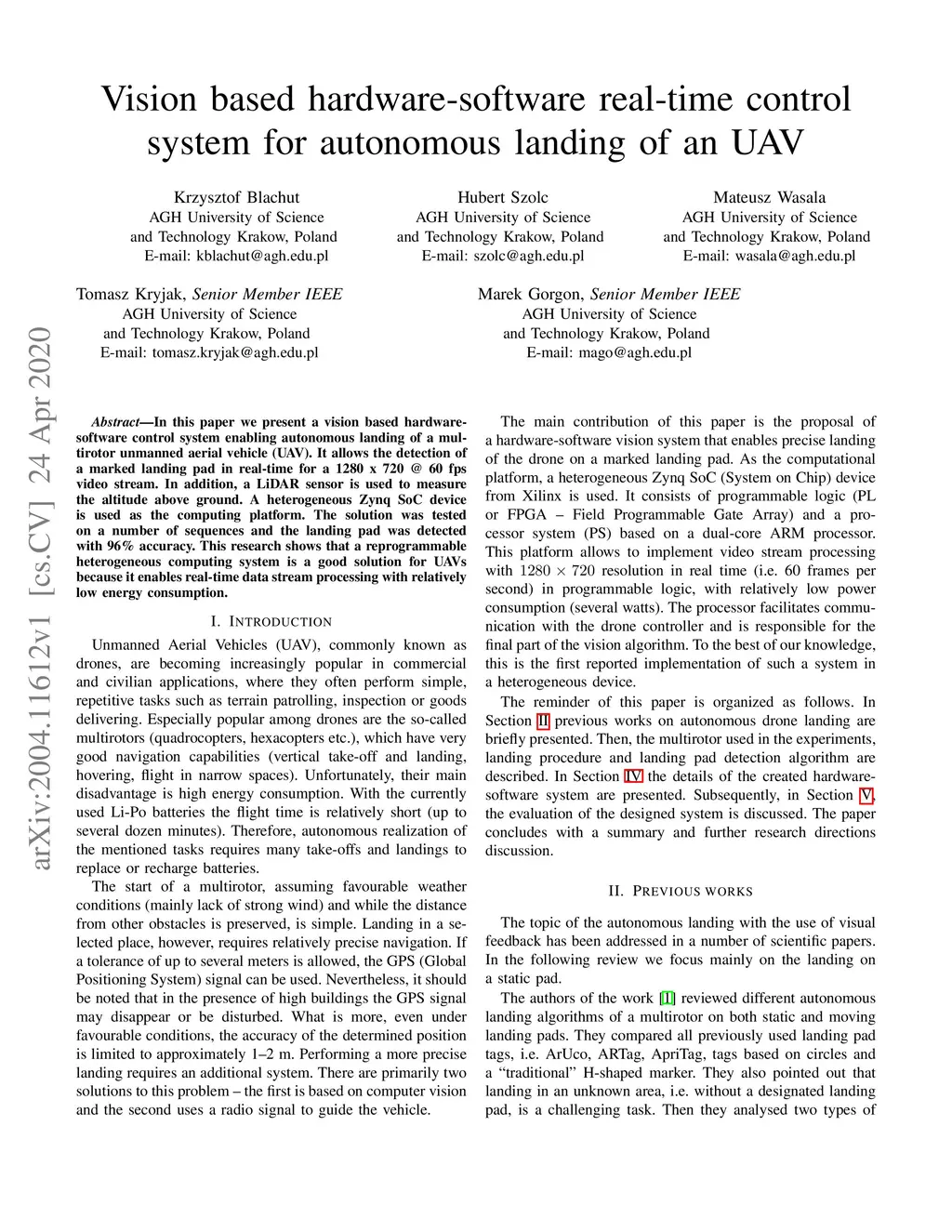 In this paper we present a vision based hardware-software control system enabling autonomous landing of a multirotor unmanned aerial vehicle (UAV). It allows the detection of a marked landing pad in real-time for a 1280 x 720 @ 60 fps video stream. In addition, a LiDAR sensor is used to measure the altitude above ground. A heterogeneous Zynq SoC device is used as the computing platform. The solution was tested on a number of sequences and the landing pad was detected with 96% accuracy. This research shows that a reprogrammable heterogeneous computing system is a good solution for UAVs because it enables real-time data stream processing with relatively low energy consumption.