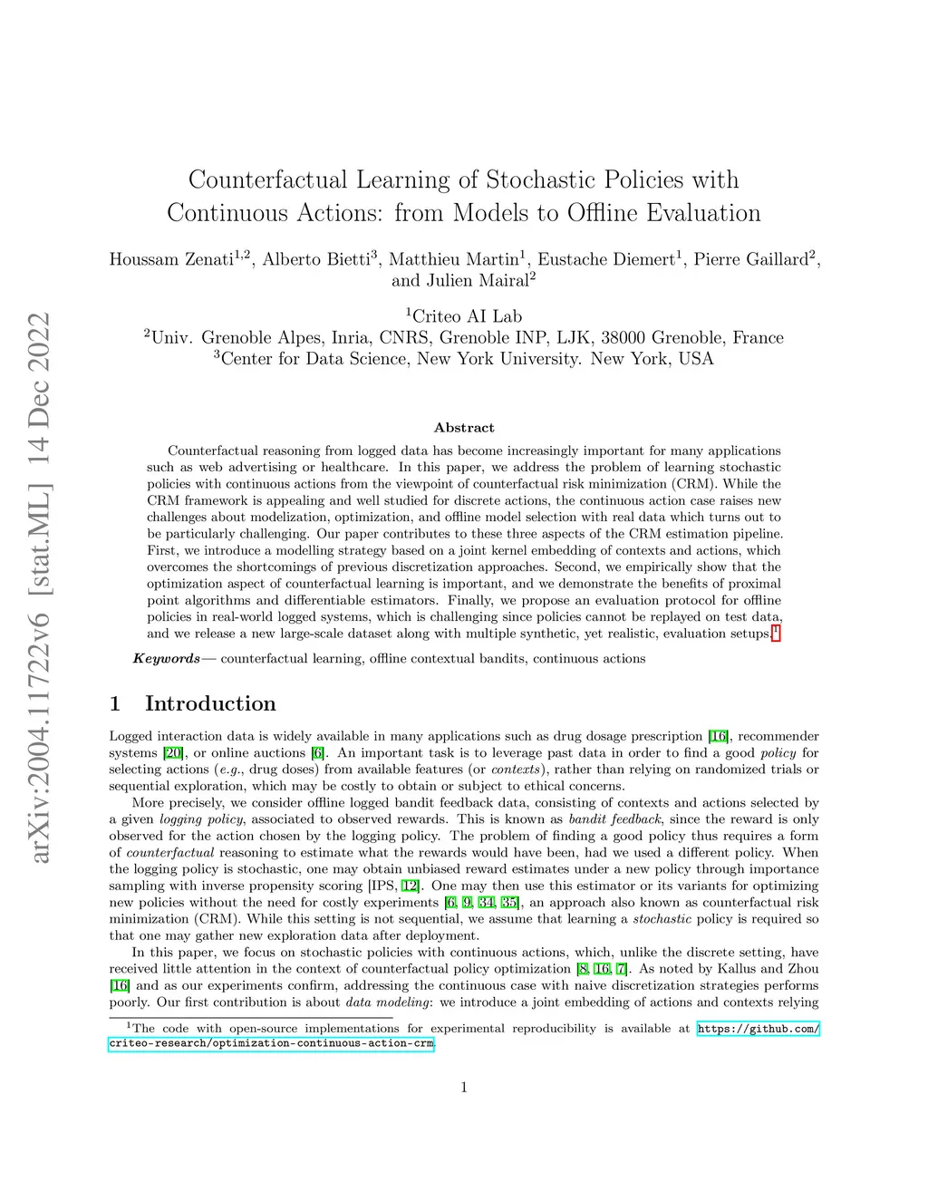 Counterfactual Learning of Stochastic Policies with Continuous Actions: