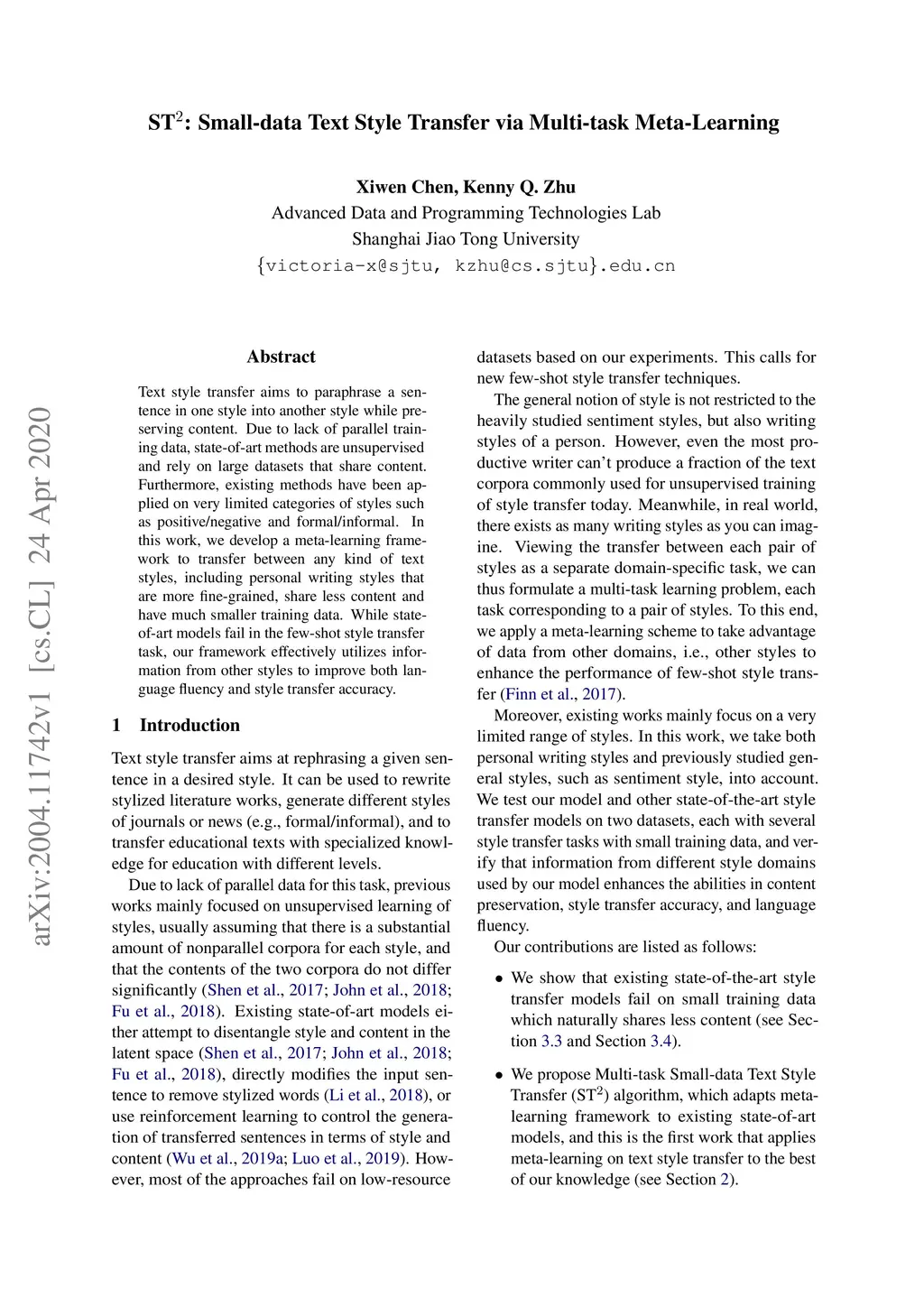 ST: Small-data Text Style Transfer via Multi-task Meta-Learning