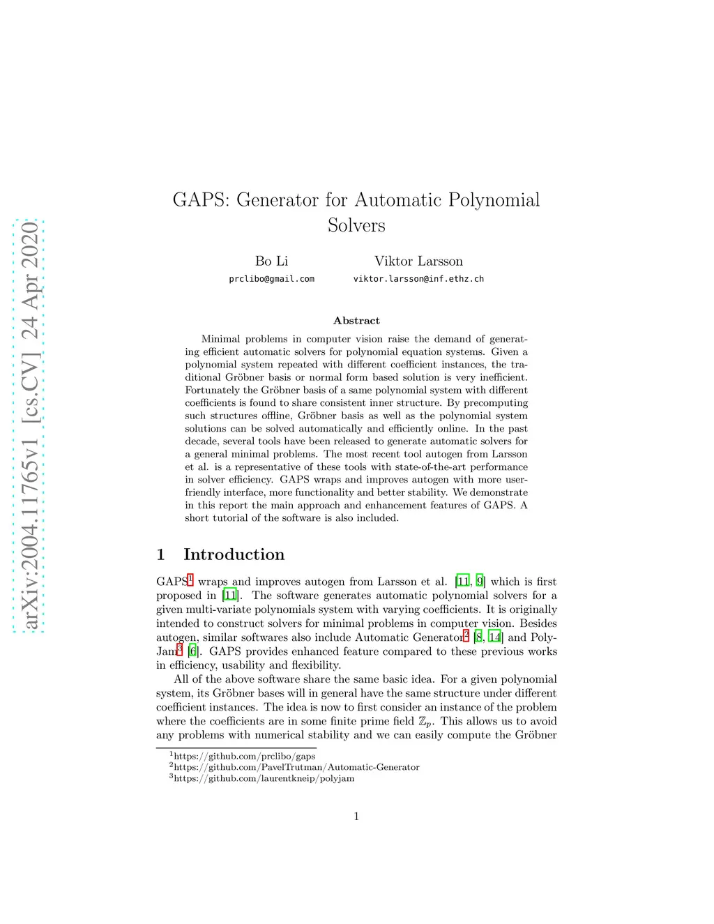 Minimal problems in computer vision raise the demand of generating efficient automatic solvers for polynomial equation systems. Given a polynomial system repeated with different coefficient instances, the traditional Gr\"obner basis or normal form based solution is very inefficient. Fortunately the Gr\"obner basis of a same polynomial system with different coefficients is found to share consistent inner structure. By precomputing such structures offline, Gr\"obner basis as well as the polynomial system solutions can be solved automatically and efficiently online. In the past decade, several tools have been released to generate automatic solvers for a general minimal problems. The most recent tool autogen from Larsson et al. is a representative of these tools with state-of-the-art performance in solver efficiency. GAPS wraps and improves autogen with more user-friendly interface, more functionality and better stability. We demonstrate in this report the main approach and enhancement features of GAPS. A short tutorial of the software is also included.