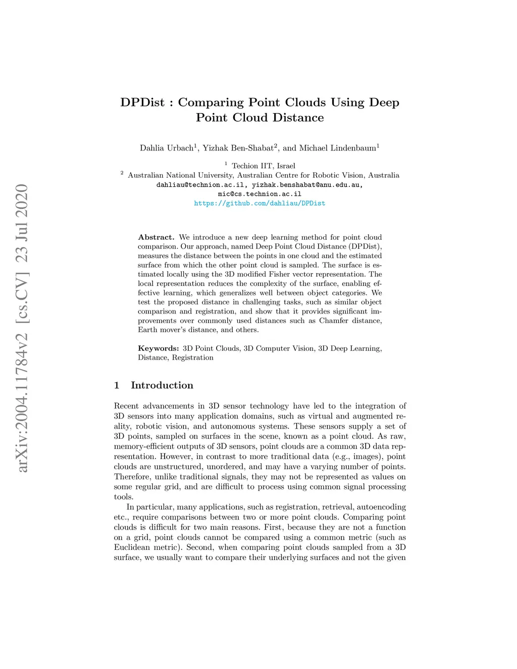 We introduce a new deep learning method for point cloud comparison. Our approach, named Deep Point Cloud Distance (DPDist), measures the distance between the points in one cloud and the estimated surface from which the other point cloud is sampled. The surface is estimated locally and efficiently using the 3D modified Fisher vector representation. The local representation reduces the complexity of the surface, enabling efficient and effective learning, which generalizes well between object categories. We test the proposed distance in challenging tasks, such as similar object comparison and registration, and show that it provides significant improvements over commonly used distances such as Chamfer distance, Earth mover's distance, and others.
