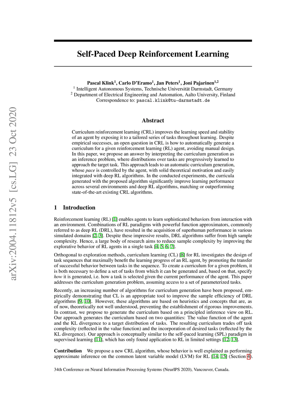 Curriculum reinforcement learning (CRL) improves the learning speed and stability of an agent by exposing it to a tailored series of tasks throughout learning. Despite empirical successes, an open question in CRL is how to automatically generate a curriculum for a given reinforcement learning (RL) agent, avoiding manual design. In this paper, we propose an answer by interpreting the curriculum generation as an inference problem, where distributions over tasks are progressively learned to approach the target task. This approach leads to an automatic curriculum generation, whose pace is controlled by the agent, with solid theoretical motivation and easily integrated with deep RL algorithms. In the conducted experiments, the curricula generated with the proposed algorithm significantly improve learning performance across several environments and deep RL algorithms, matching or outperforming state-of-the-art existing CRL algorithms.