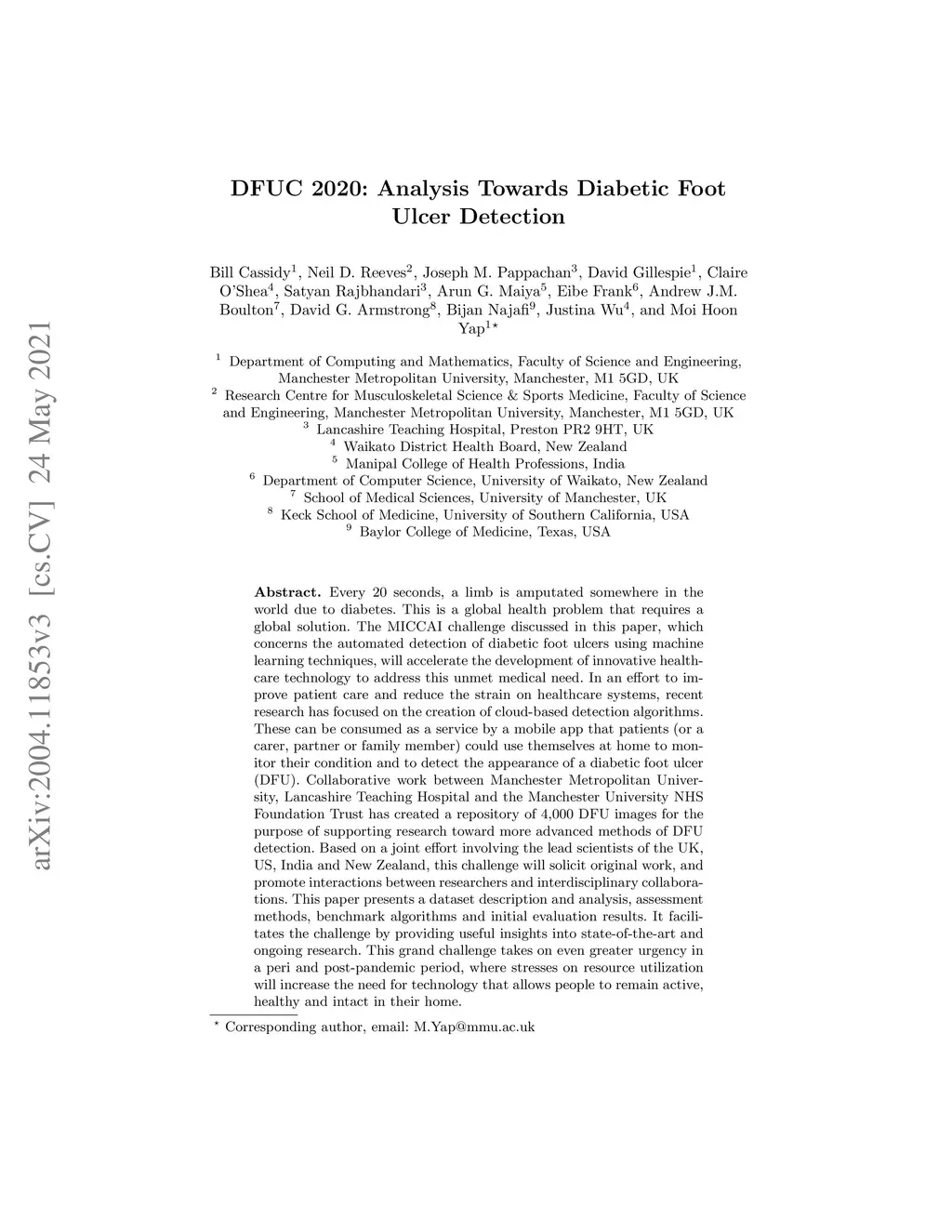 Every 20 seconds, a limb is amputated somewhere in the world due to diabetes. This is a global health problem that requires a global solution. The MICCAI challenge discussed in this paper, which concerns the automated detection of diabetic foot ulcers using machine learning techniques, will accelerate the development of innovative healthcare technology to address this unmet medical need. In an effort to improve patient care and reduce the strain on healthcare systems, recent research has focused on the creation of cloud-based detection algorithms. These can be consumed as a service by a mobile app that patients (or a carer, partner or family member) could use themselves at home to monitor their condition and to detect the appearance of a diabetic foot ulcer (DFU). Collaborative work between Manchester Metropolitan University, Lancashire Teaching Hospital and the Manchester University NHS Foundation Trust has created a repository of 4,000 DFU images for the purpose of supporting research toward more advanced methods of DFU detection. Based on a joint effort involving the lead scientists of the UK, US, India and New Zealand, this challenge will solicit original work, and promote interactions between researchers and interdisciplinary collaborations. This paper presents a dataset description and analysis, assessment methods, benchmark algorithms and initial evaluation results. It facilitates the challenge by providing useful insights into state-of-the-art and ongoing research. This grand challenge takes on even greater urgency in a peri and post-pandemic period, where stresses on resource utilization will increase the need for technology that allows people to remain active, healthy and intact in their home.