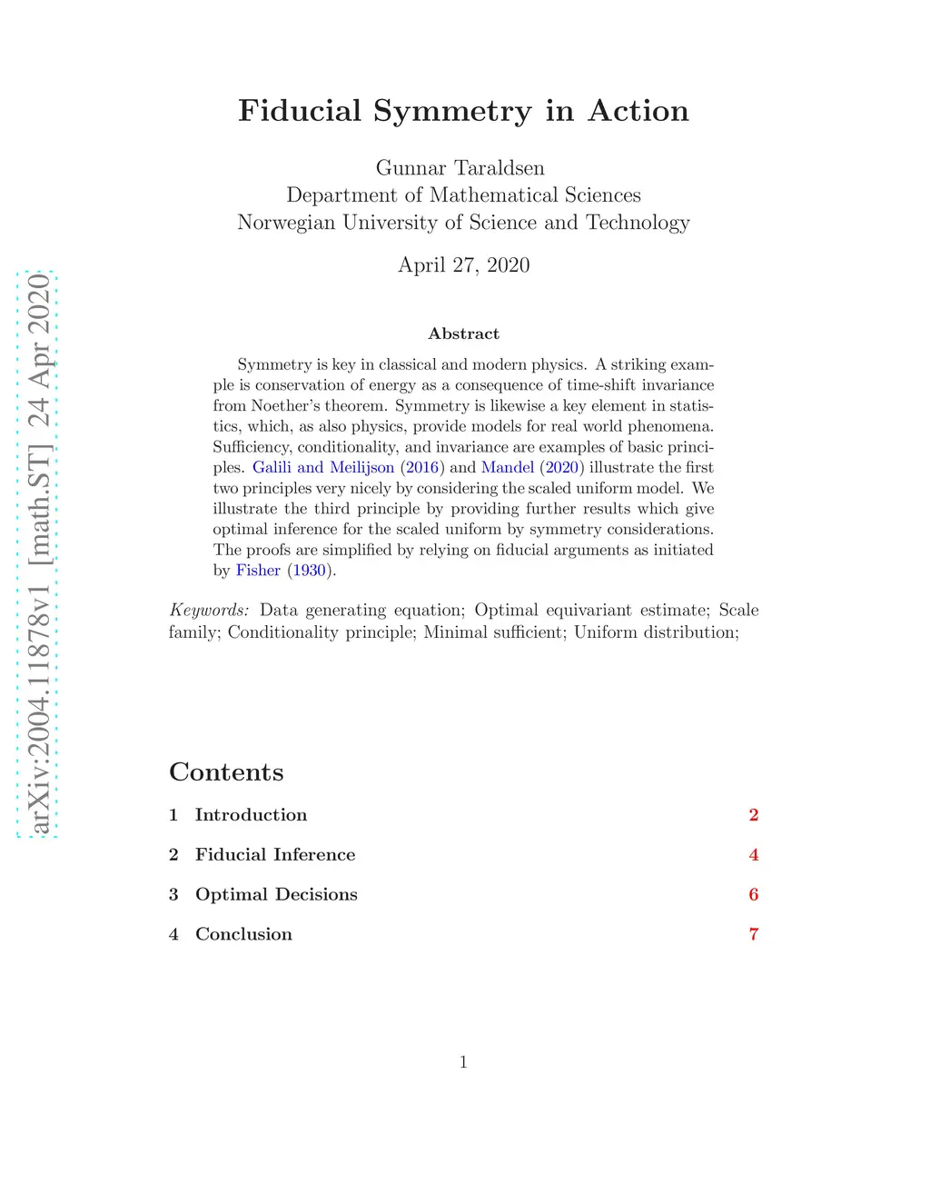 Symmetry is key in classical and modern physics. A striking example is conservation of energy as a consequence of time-shift invariance from Noether's theorem. Symmetry is likewise a key element in statistics, which, as also physics, provide models for real world phenomena. Sufficiency, conditionality, and invariance are examples of basic principles. Galili and Meilijson (2016) and Mandel (2020) illustrate the first two principles very nicely by considering the scaled uniform model. We illustrate the third principle by providing further results which give optimal inference for the scaled uniform by symmetry considerations. The proofs are simplified by relying on fiducial arguments as initiated by Fisher (1930). Keywords: Data generating equation; Optimal equivariant estimate; Scale family; Conditionality principle; Minimal sufficient; Uniform distribution;
