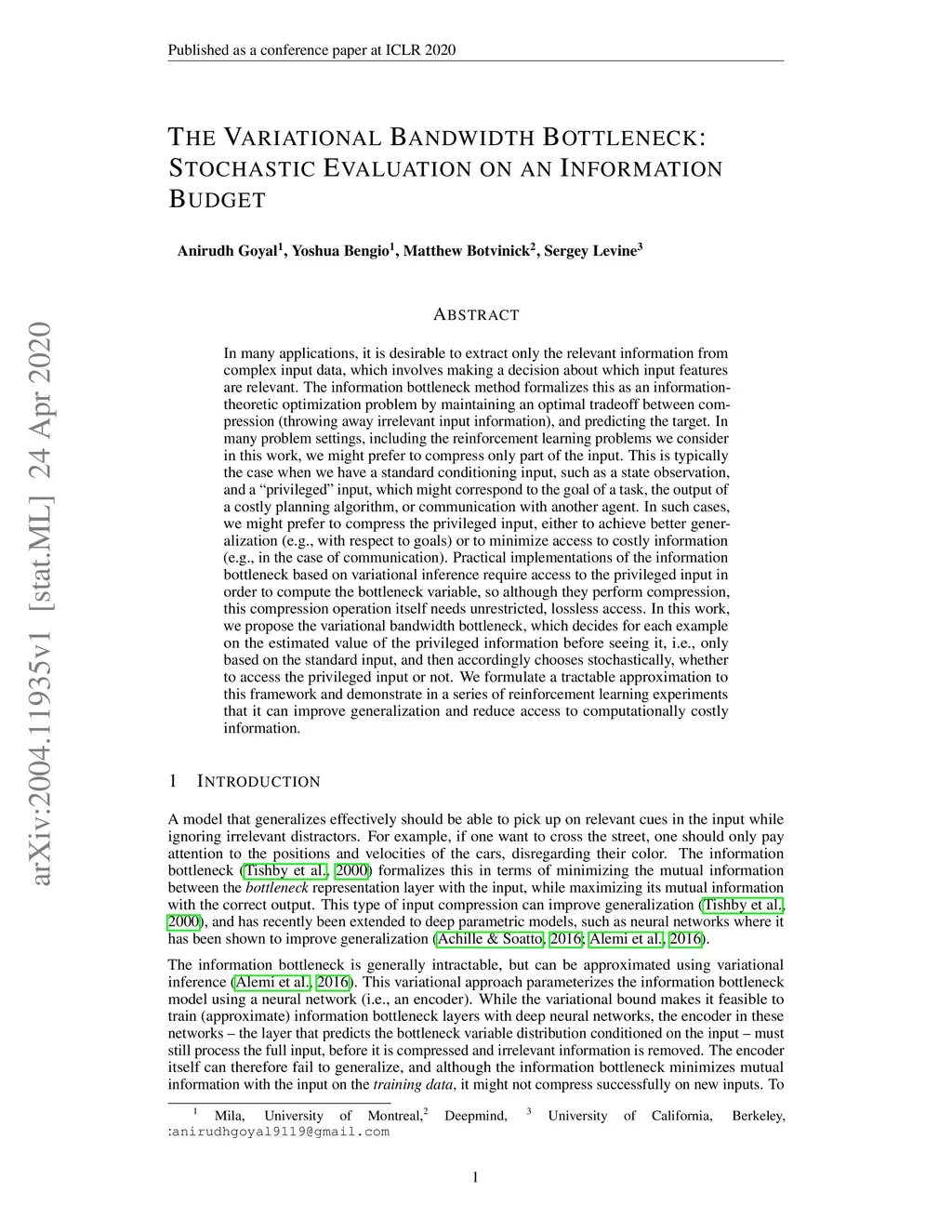 In many applications, it is desirable to extract only the relevant information from complex input data, which involves making a decision about which input features are relevant. The information bottleneck method formalizes this as an information-theoretic optimization problem by maintaining an optimal tradeoff between compression (throwing away irrelevant input information), and predicting the target. In many problem settings, including the reinforcement learning problems we consider in this work, we might prefer to compress only part of the input. This is typically the case when we have a standard conditioning input, such as a state observation, and a "privileged" input, which might correspond to the goal of a task, the output of a costly planning algorithm, or communication with another agent. In such cases, we might prefer to compress the privileged input, either to achieve better generalization (e.g., with respect to goals) or to minimize access to costly information (e.g., in the case of communication). Practical implementations of the information bottleneck based on variational inference require access to the privileged input in order to compute the bottleneck variable, so although they perform compression, this compression operation itself needs unrestricted, lossless access. In this work, we propose the variational bandwidth bottleneck, which decides for each example on the estimated value of the privileged information before seeing it, i.e., only based on the standard input, and then accordingly chooses stochastically, whether to access the privileged input or not. We formulate a tractable approximation to this framework and demonstrate in a series of reinforcement learning experiments that it can improve generalization and reduce access to computationally costly information.