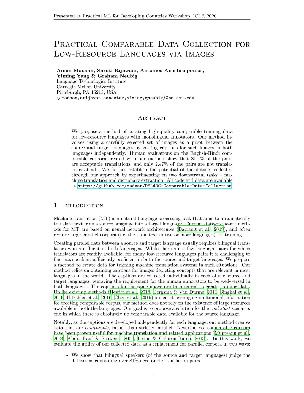 We propose a method of curating high-quality comparable training data for low-resource languages with monolingual annotators. Our method involves using a carefully selected set of images as a pivot between the source and target languages by getting captions for such images in both languages independently. Human evaluations on the English-Hindi comparable corpora created with our method show that 81.1% of the pairs are acceptable translations, and only 2.47% of the pairs are not translations at all. We further establish the potential of the dataset collected through our approach by experimenting on two downstream tasks - machine translation and dictionary extraction. All code and data are available at https://github.com/madaan/PML4DC-Comparable-Data-Collection.