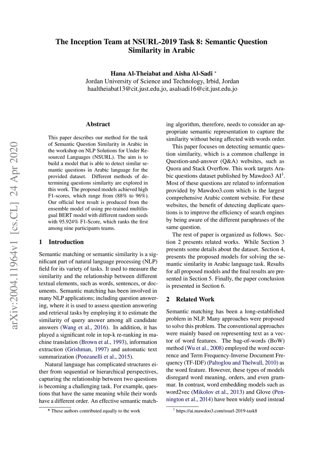 This paper describes our method for the task of Semantic Question Similarity in Arabic in the workshop on NLP Solutions for Under-Resourced Languages (NSURL). The aim is to build a model that is able to detect similar semantic questions in the Arabic language for the provided dataset. Different methods of determining questions similarity are explored in this work. The proposed models achieved high F1-scores, which range from (88% to 96%). Our official best result is produced from the ensemble model of using a pre-trained multilingual BERT model with different random seeds with 95.924% F1-Score, which ranks the first among nine participants teams.
