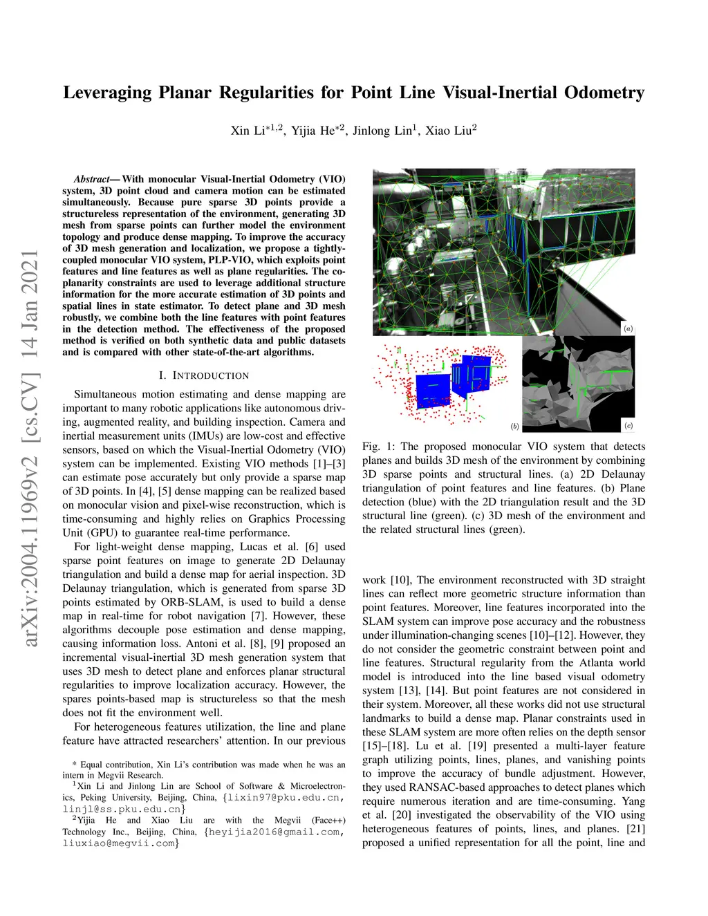 With monocular Visual-Inertial Odometry (VIO) system, 3D point cloud and camera motion can be estimated simultaneously. Because pure sparse 3D points provide a structureless representation of the environment, generating 3D mesh from sparse points can further model the environment topology and produce dense mapping. To improve the accuracy of 3D mesh generation and localization, we propose a tightly-coupled monocular VIO system, PLP-VIO, which exploits point features and line features as well as plane regularities. The co-planarity constraints are used to leverage additional structure information for the more accurate estimation of 3D points and spatial lines in state estimator. To detect plane and 3D mesh robustly, we combine both the line features with point features in the detection method. The effectiveness of the proposed method is verified on both synthetic data and public datasets and is compared with other state-of-the-art algorithms.