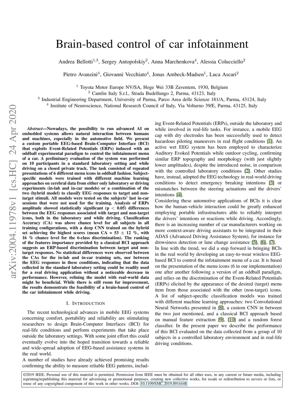 Nowadays, the possibility to run advanced AI on embedded systems allows natural interaction between humans and machines, especially in the automotive field. We present a custom portable EEG-based Brain-Computer Interface (BCI) that exploits Event-Related Potentials (ERPs) induced with an oddball experimental paradigm to control the infotainment menu of a car. A preliminary evaluation of the system was performed on 10 participants in a standard laboratory setting and while driving on a closed private track. The task consisted of repeated presentations of 6 different menu icons in oddball fashion. Subject-specific models were trained with different machine learning approaches on cerebral data from either only laboratory or driving experiments (in-lab and in-car models) or a combination of the two (hybrid model) to classify EEG responses to target and non-target stimuli. All models were tested on the subjects' last in-car sessions that were not used for the training. Analysis of ERPs amplitude showed statistically significant (p < 0.05) differences between the EEG responses associated with target and non-target icons, both in the laboratory and while driving. Classification Accuracy (CA) was above chance level for all subjects in all training configurations, with a deep CNN trained on the hybrid set achieving the highest scores (mean CA = 53 12 %, with 16 % chance level for the 6-class discrimination). The ranking of the features importance provided by a classical BCI approach suggests an ERP-based discrimination between target and non-target responses. No statistical differences were observed between the CAs for the in-lab and in-car training sets, nor between the EEG responses in these conditions, indicating that the data collected in the standard laboratory setting could be readily used for a real driving application without a noticeable decrease in performance.