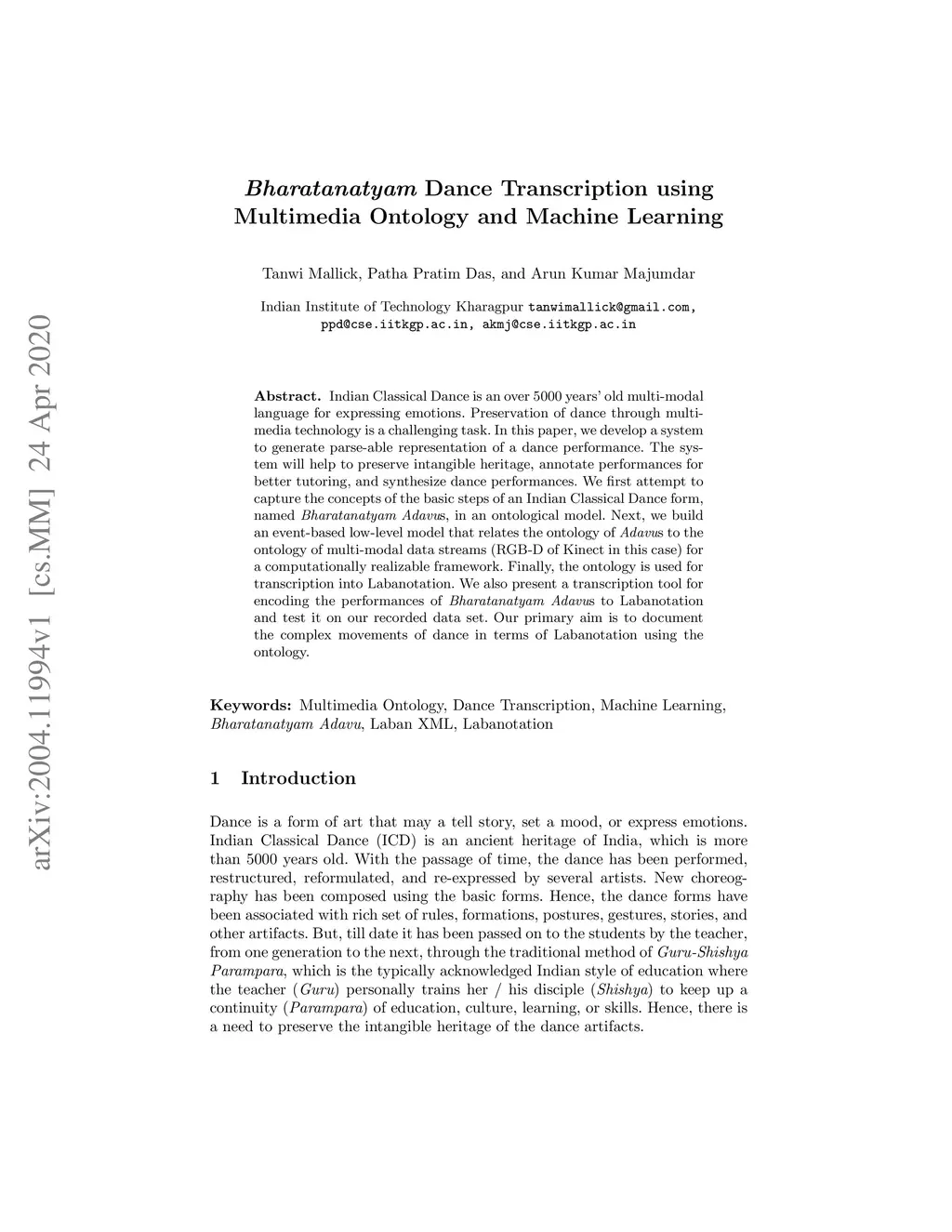 Bharatanatyam Dance Transcription using Multimedia Ontology and Machine