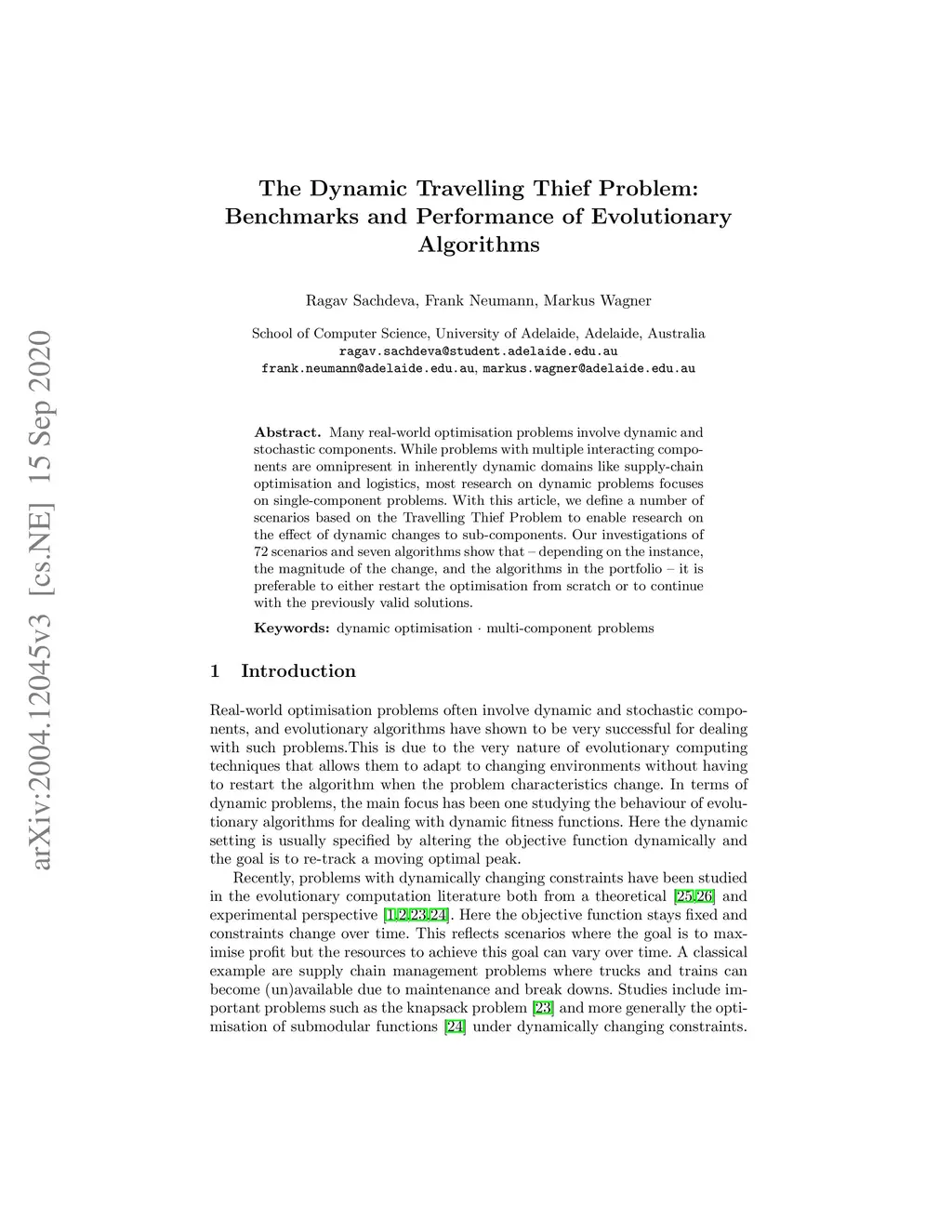 Many real-world optimisation problems involve dynamic and stochastic components. While problems with multiple interacting components are omnipresent in inherently dynamic domains like supply-chain optimisation and logistics, most research on dynamic problems focuses on single-component problems. With this article, we define a number of scenarios based on the Travelling Thief Problem to enable research on the effect of dynamic changes to sub-components. Our investigations of 72 scenarios and seven algorithms show that -- depending on the instance, the magnitude of the change, and the algorithms in the portfolio -- it is preferable to either restart the optimisation from scratch or to continue with the previously valid solutions.