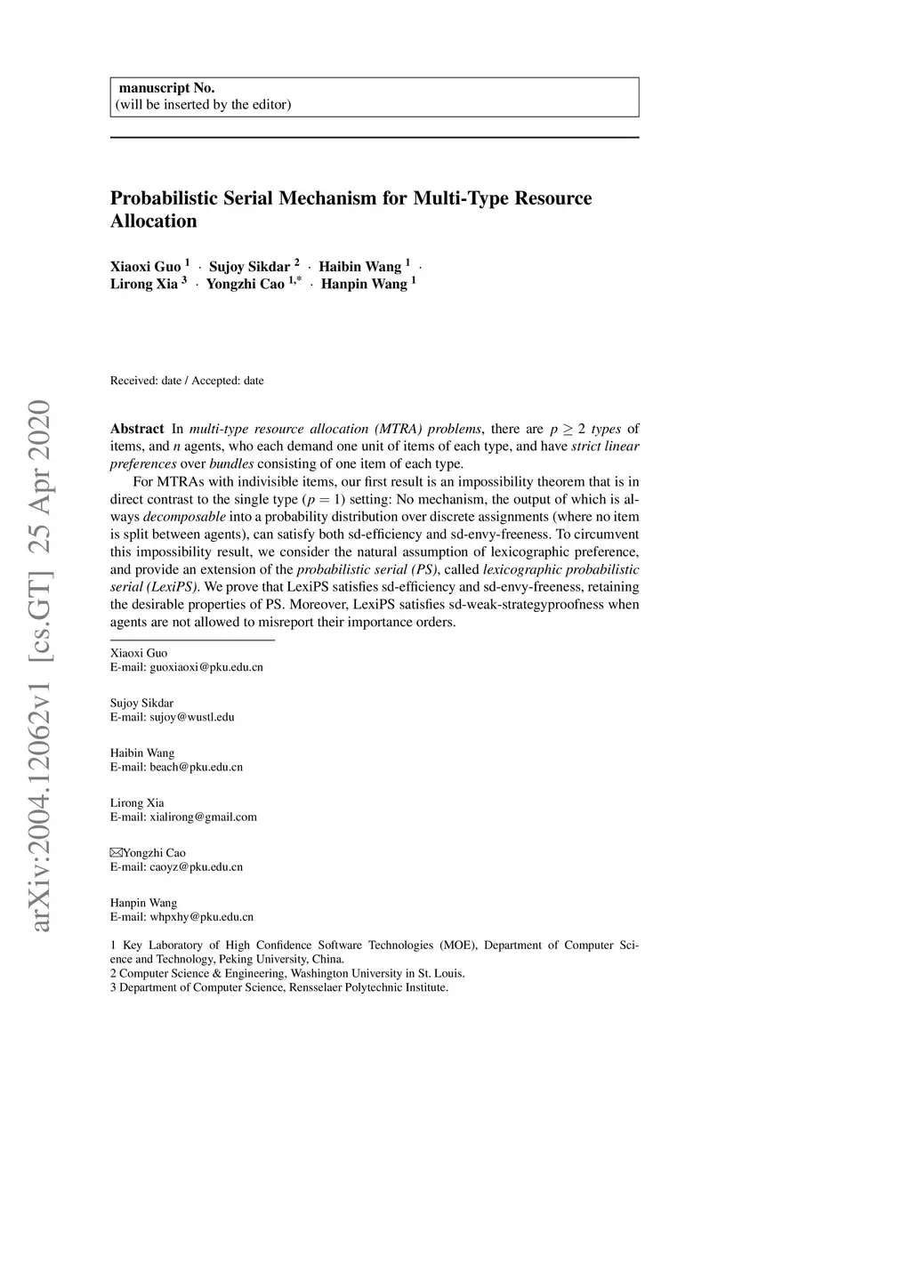 In multi-type resource allocation (MTRA) problems, there are p 2 types of items, and n agents, who each demand one unit of items of each type, and have strict linear preferences over bundles consisting of one item of each type. For MTRAs with indivisible items, our first result is an impossibility theorem that is in direct contrast to the single type (p = 1) setting: No mechanism, the output of which is always decomposable into a probability distribution over discrete assignments (where no item is split between agents), can satisfy both sd-efficiency and sd-envy-freeness. To circumvent this impossibility result, we consider the natural assumption of lexicographic preference, and provide an extension of the probabilistic serial (PS), called lexicographic probabilistic serial (LexiPS).We prove that LexiPS satisfies sd-efficiency and sd-envy-freeness, retaining the desirable properties of PS. Moreover, LexiPS satisfies sd-weak-strategyproofness when agents are not allowed to misreport their importance orders. For MTRAs with divisible items, we show that the existing multi-type probabilistic serial (MPS) mechanism satisfies the stronger efficiency notion of lexi-efficiency, and is sd-envy-free under strict linear preferences, and sd-weak-strategyproof under lexicographic preferences. We also prove that MPS can be characterized both by leximin-ptimality and by item-wise ordinal fairness, and the family of eating algorithms which MPS belongs to can be characterized by no-generalized-cycle condition.